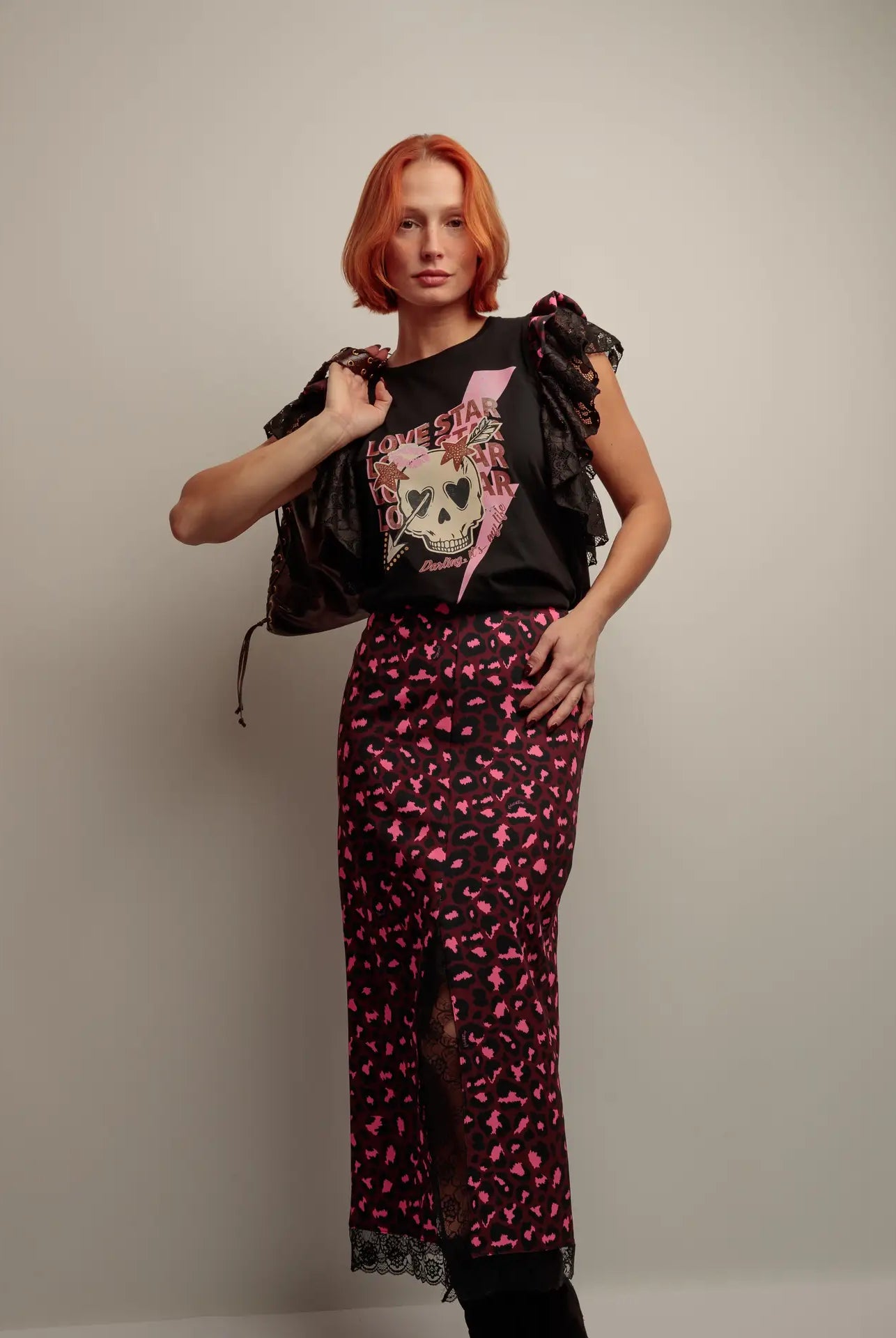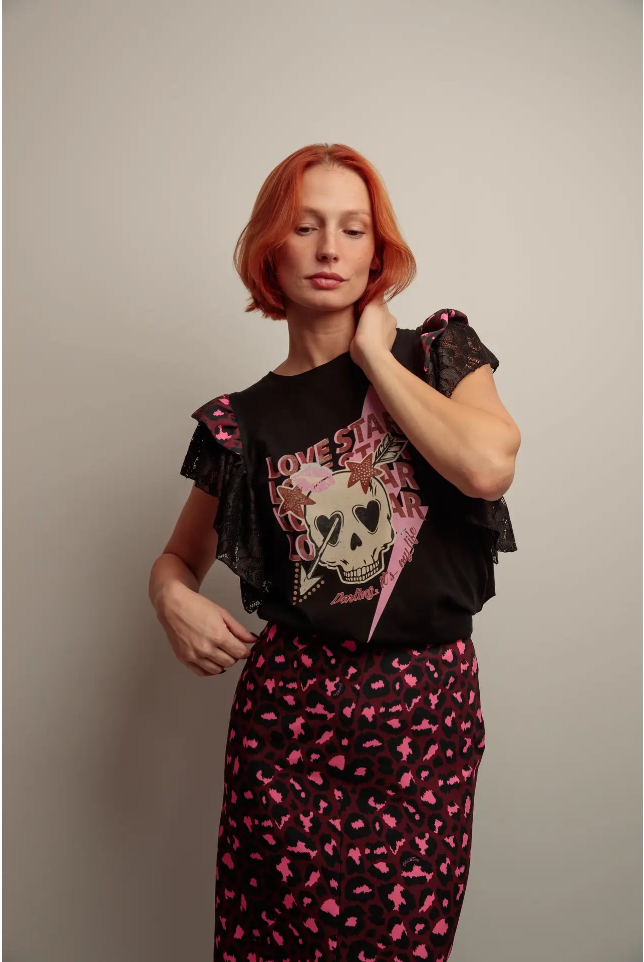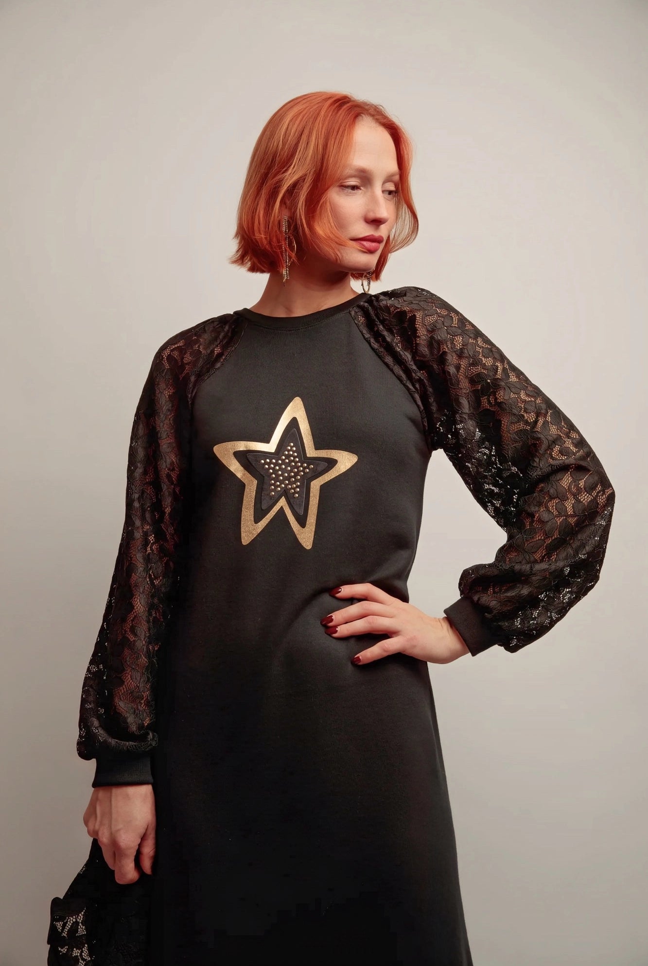 🔹 Détails marquants : Manches raglan en dentelle, patch étoile dorée à sequins, finitions soignées,