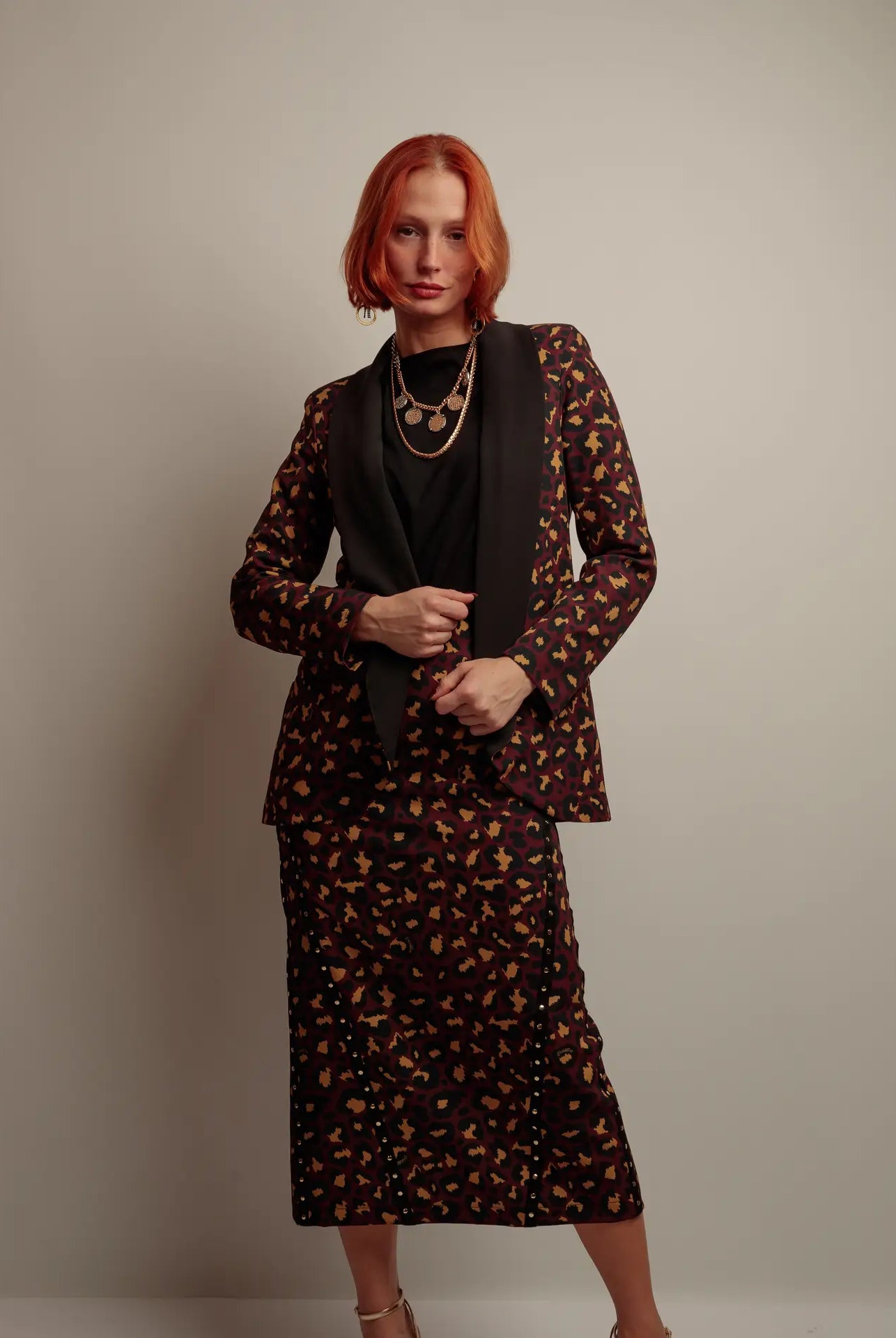 🔹 Coupe / Forme : Droite, longueur midi à longue, avec fentes latérales pour plus d’aisance