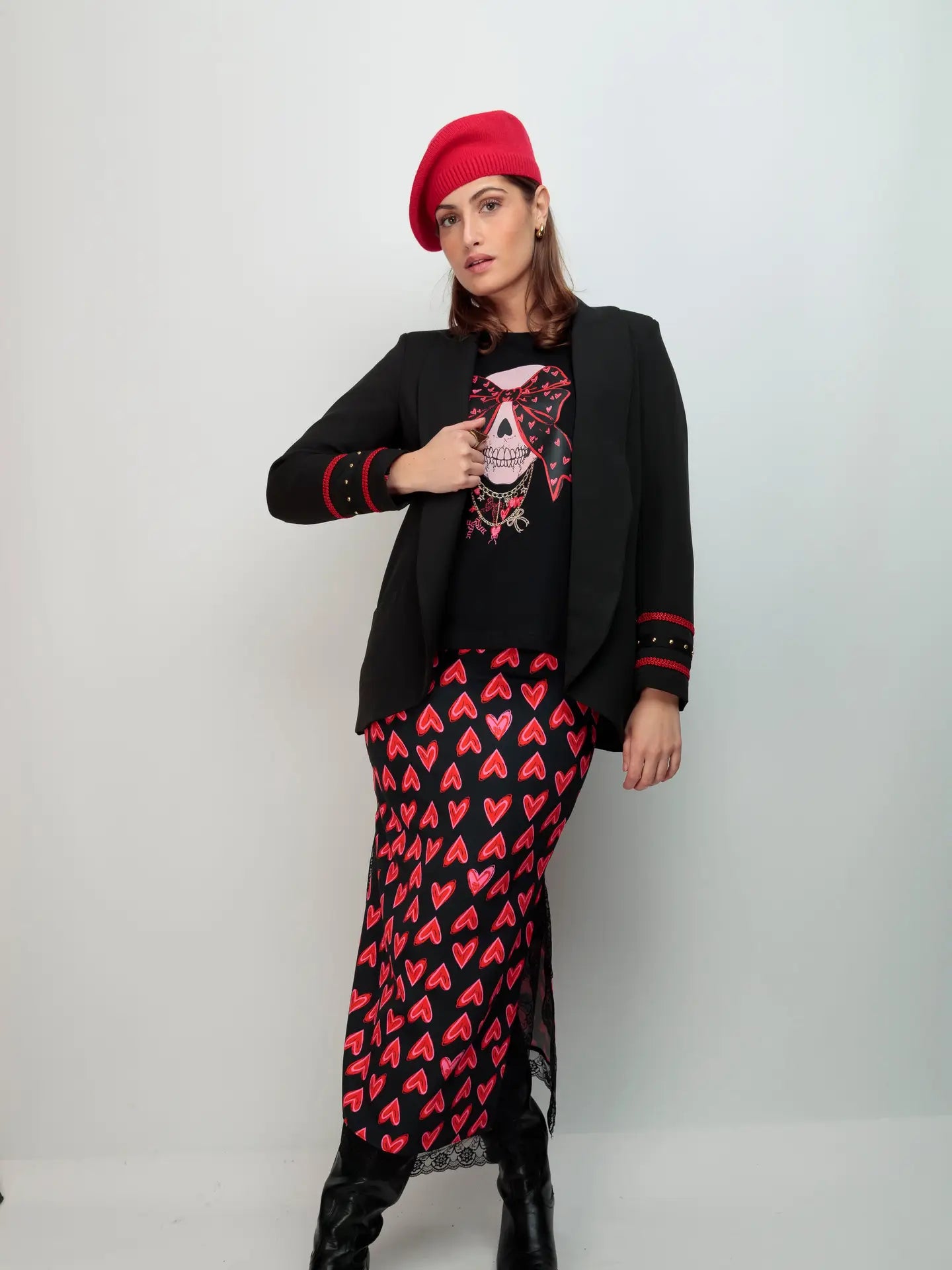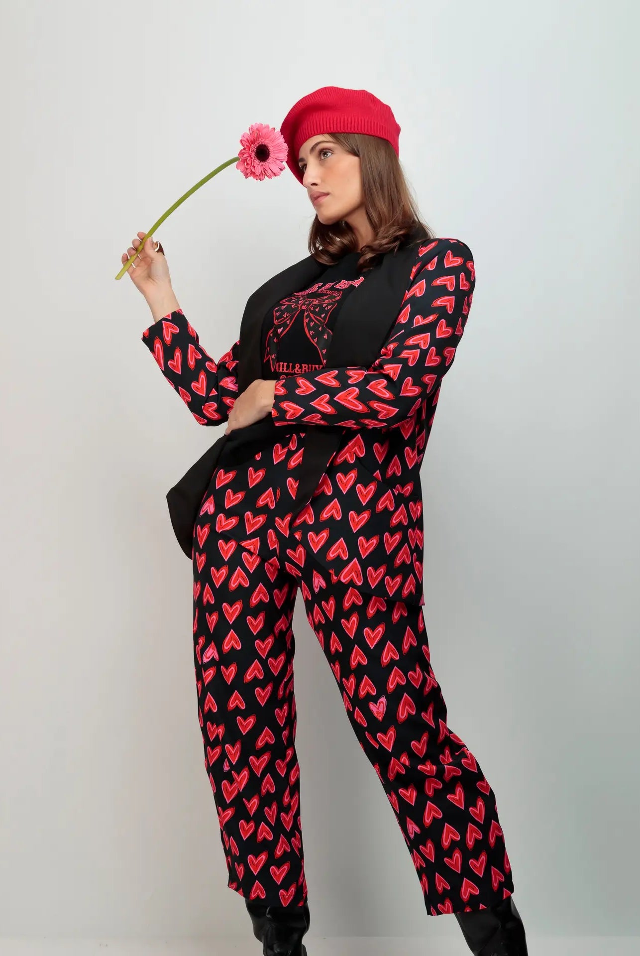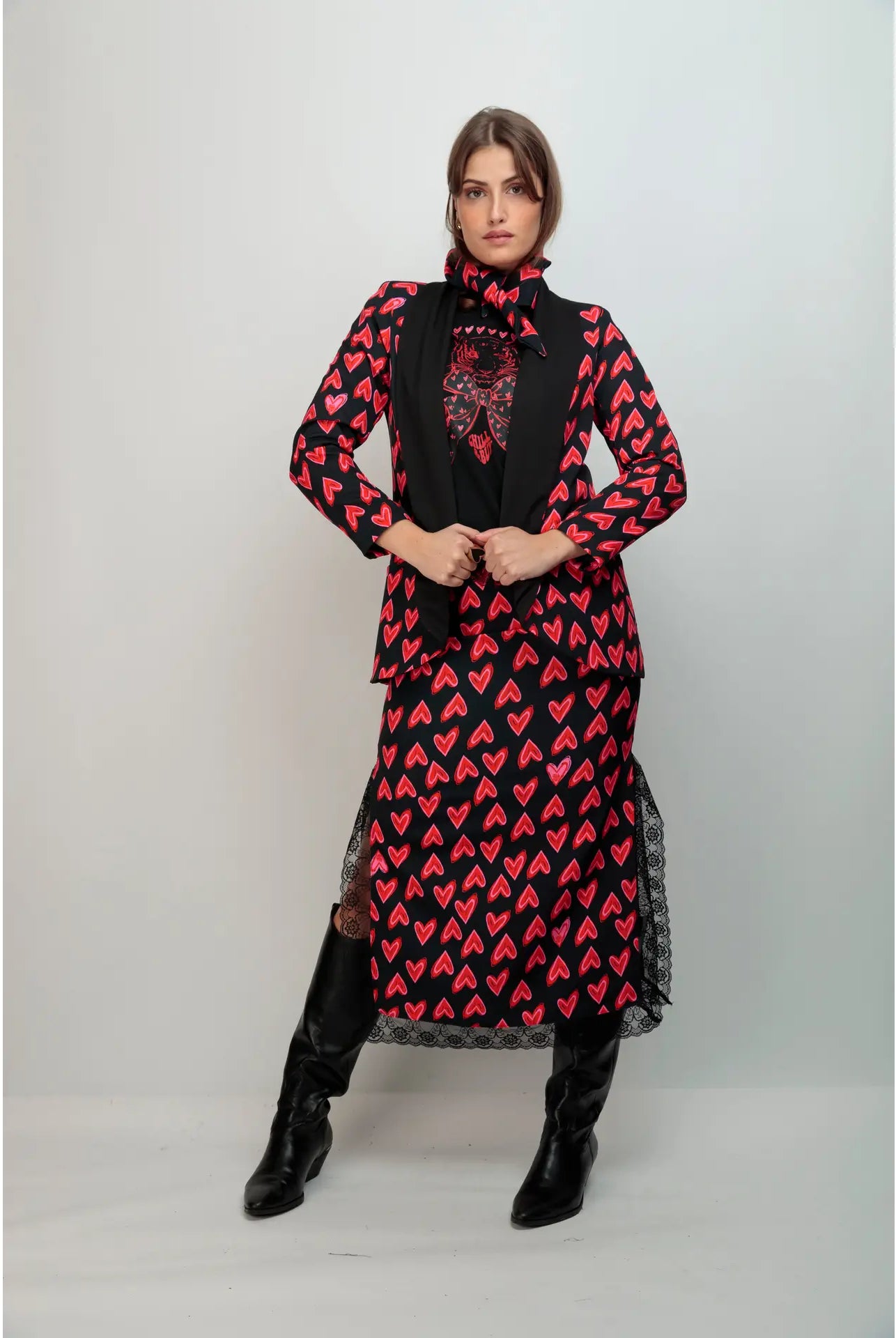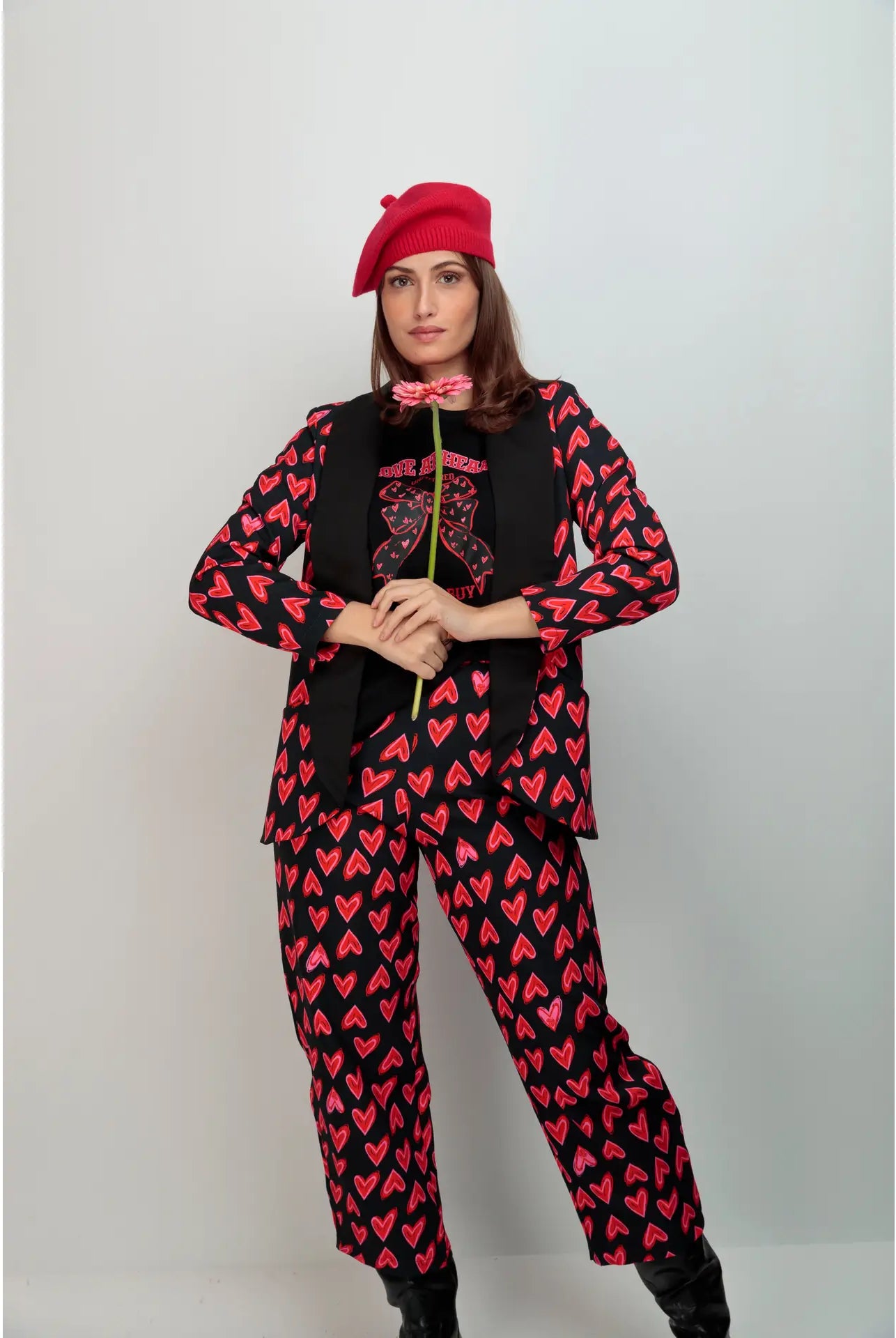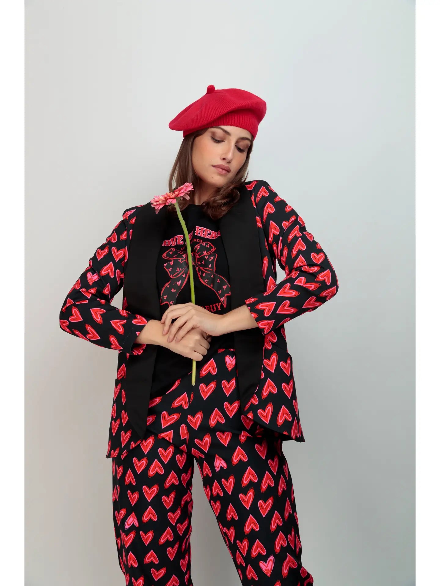 🔹 Details marquants : Revers classiques, poches de plastron fonctionnelles, imprime coeurs rouges sur fond noir, message contraste “Love Me More” au dos