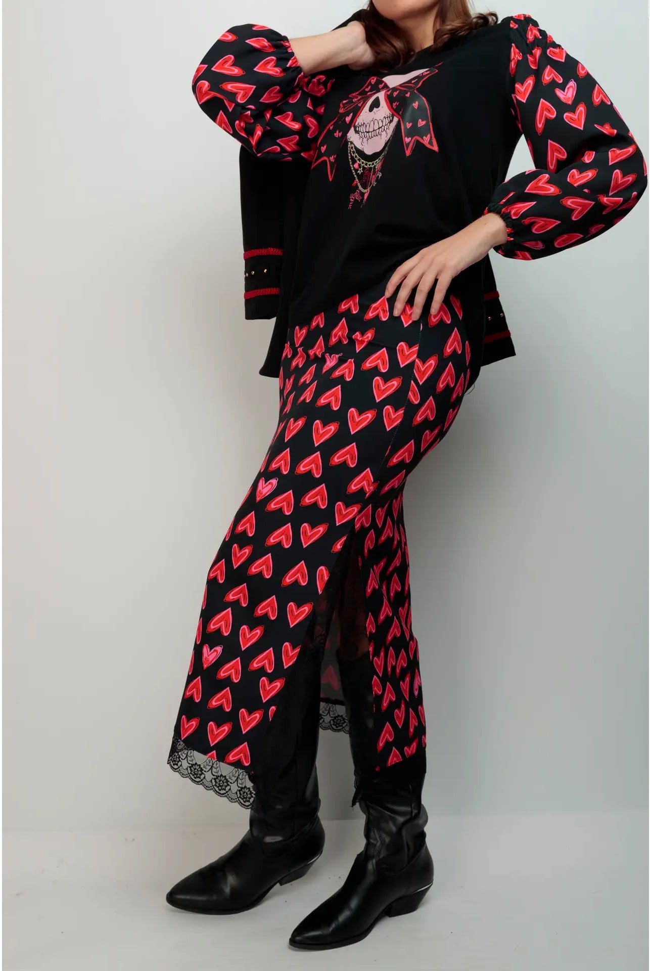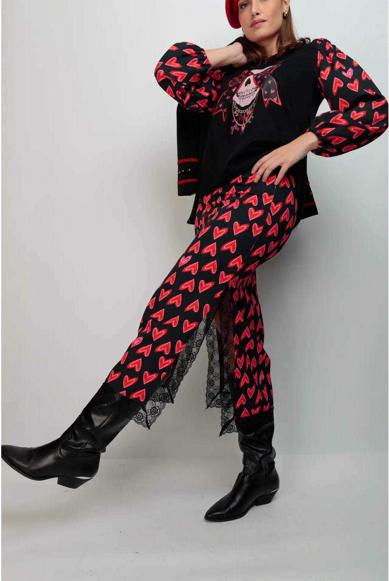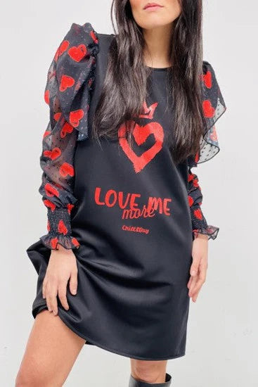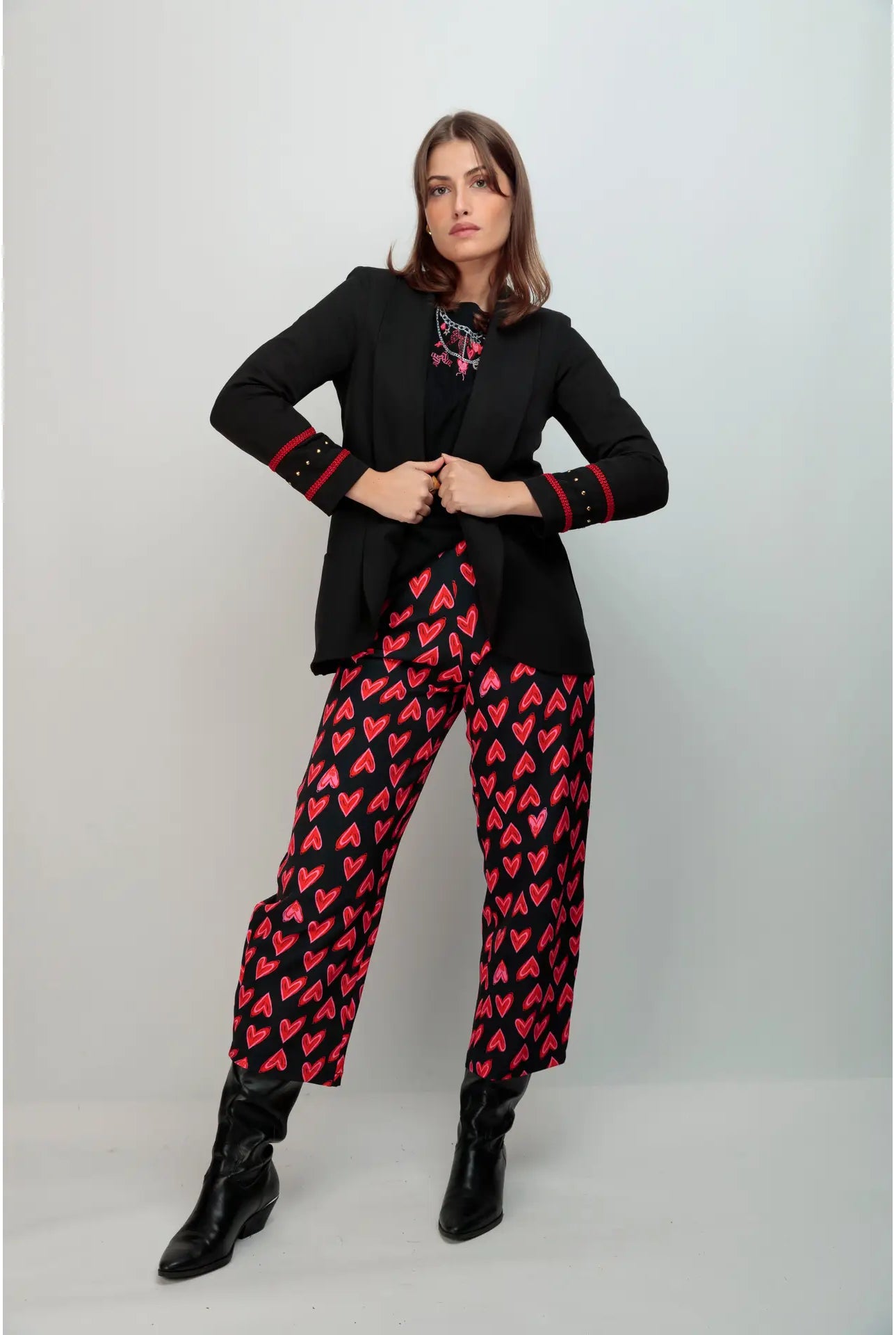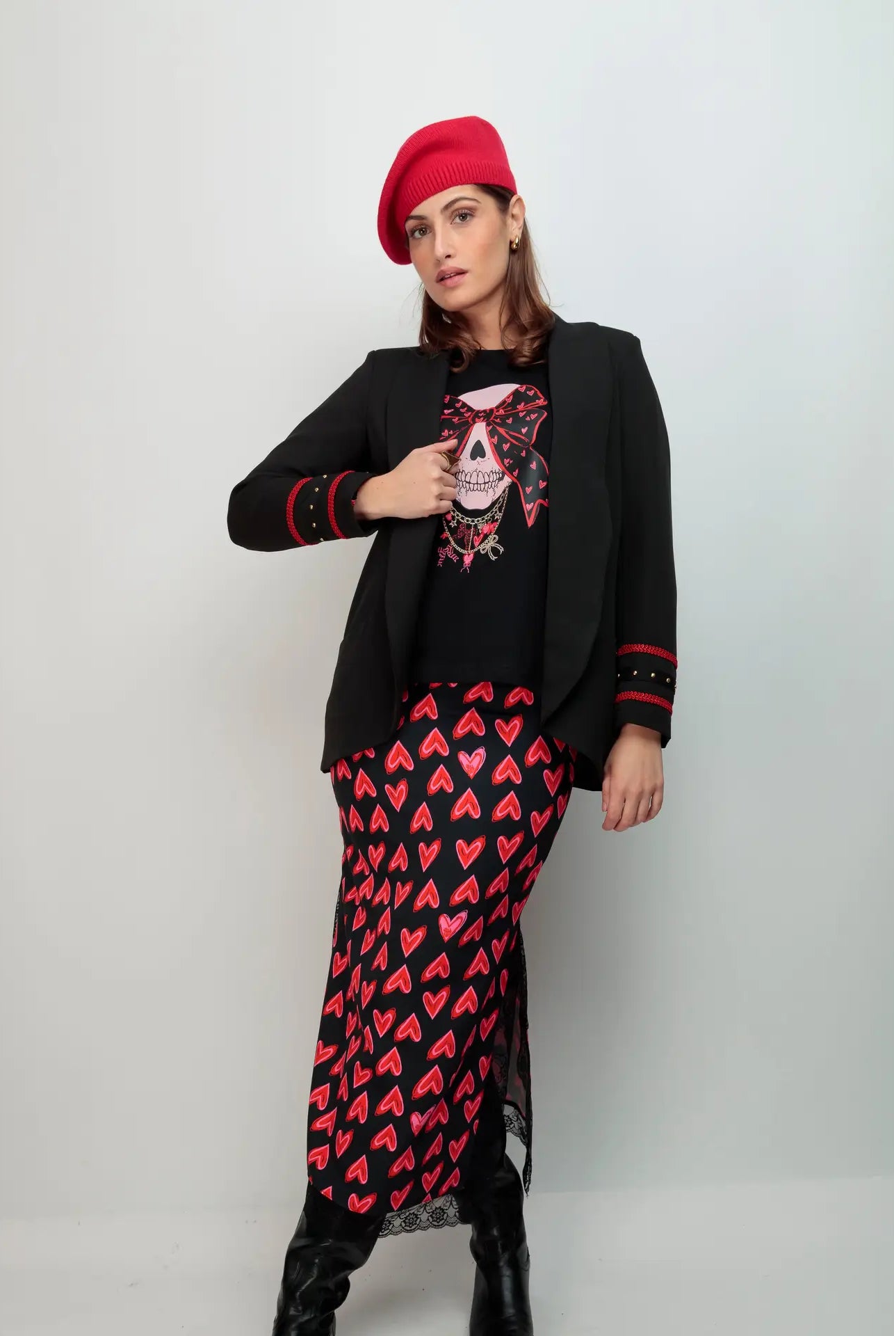 🔹 Details marquants : Revers classiques, poches de plastron fonctionnelles, imprime coeurs rouges sur fond noir, message contraste “Love Me More” au dos
