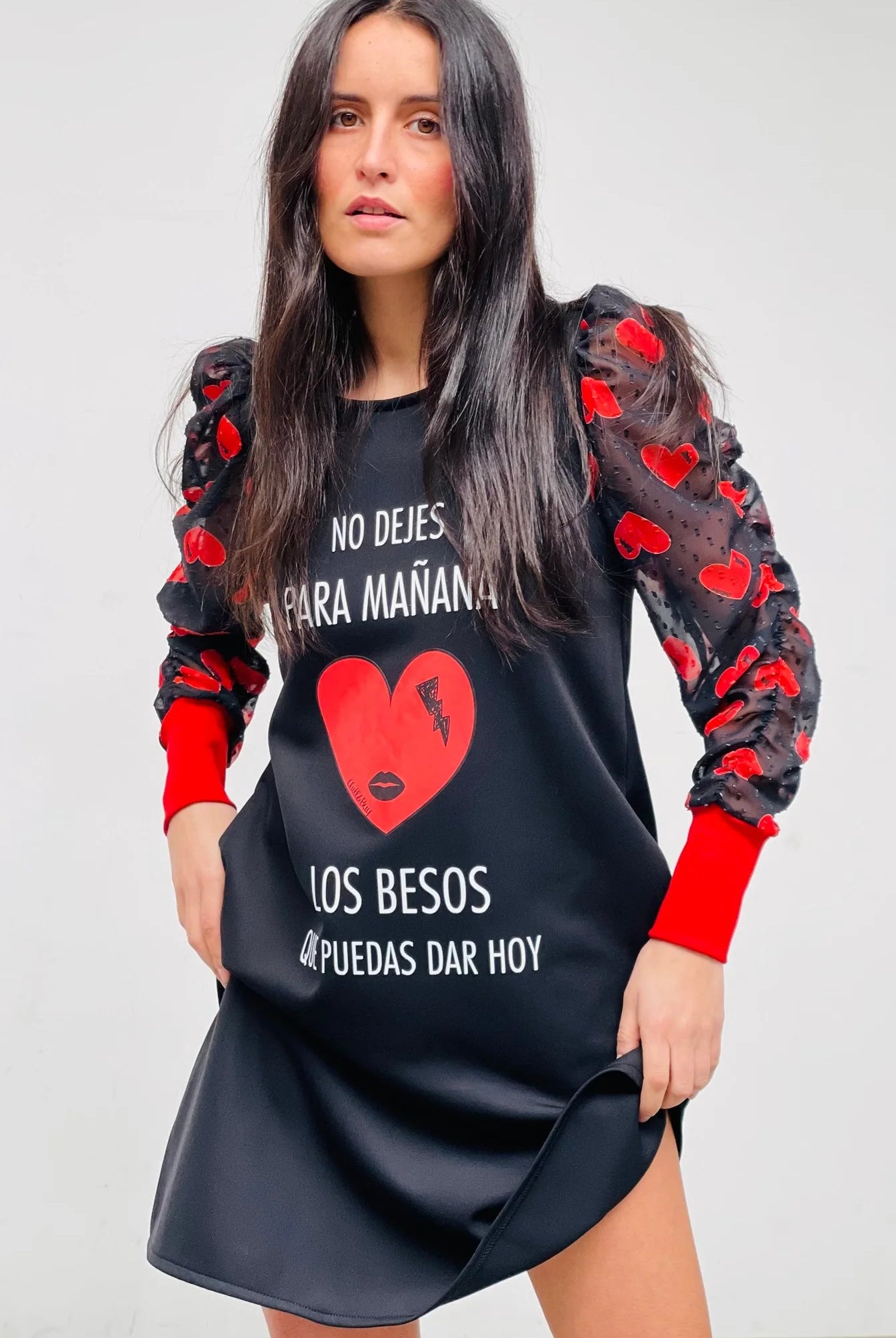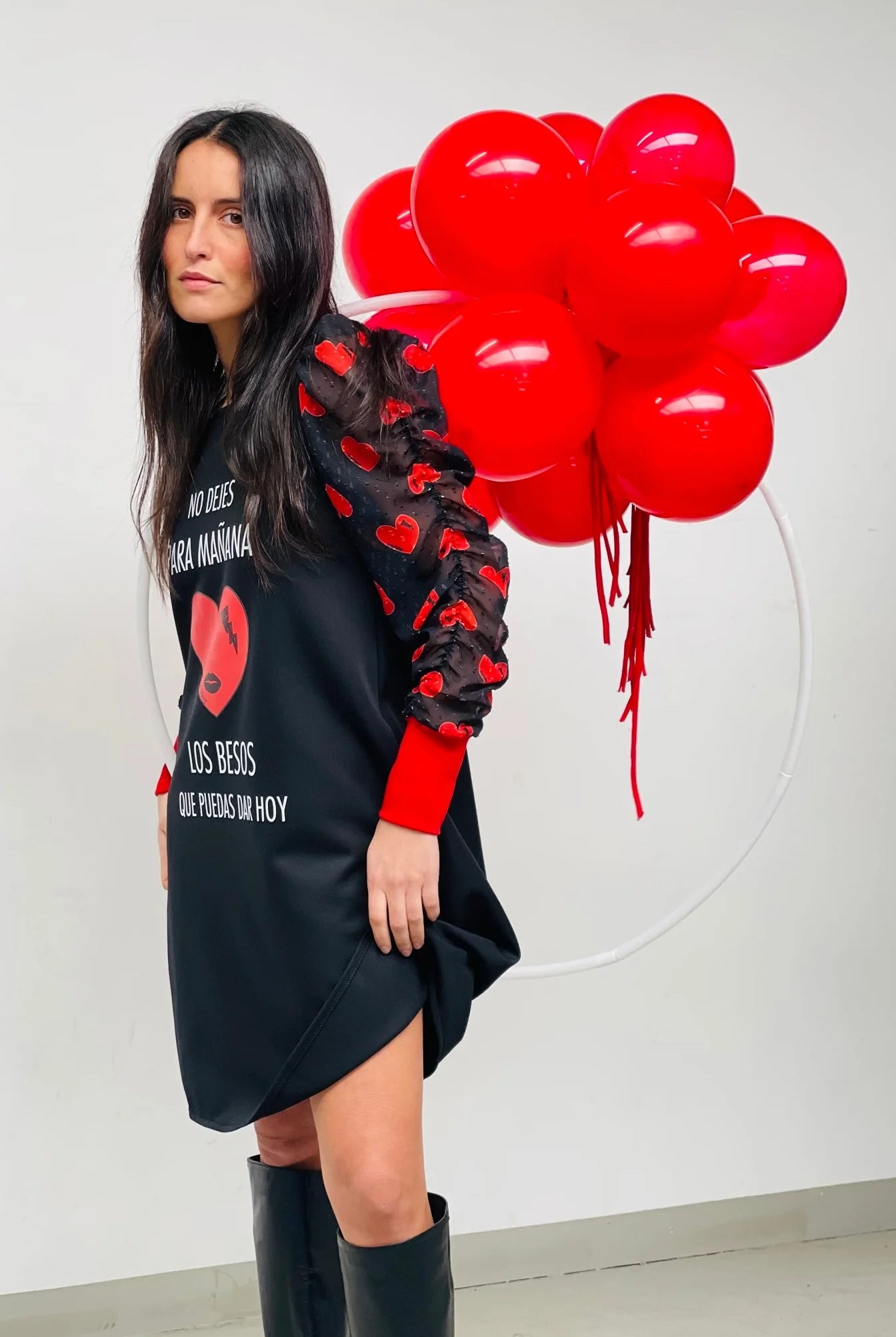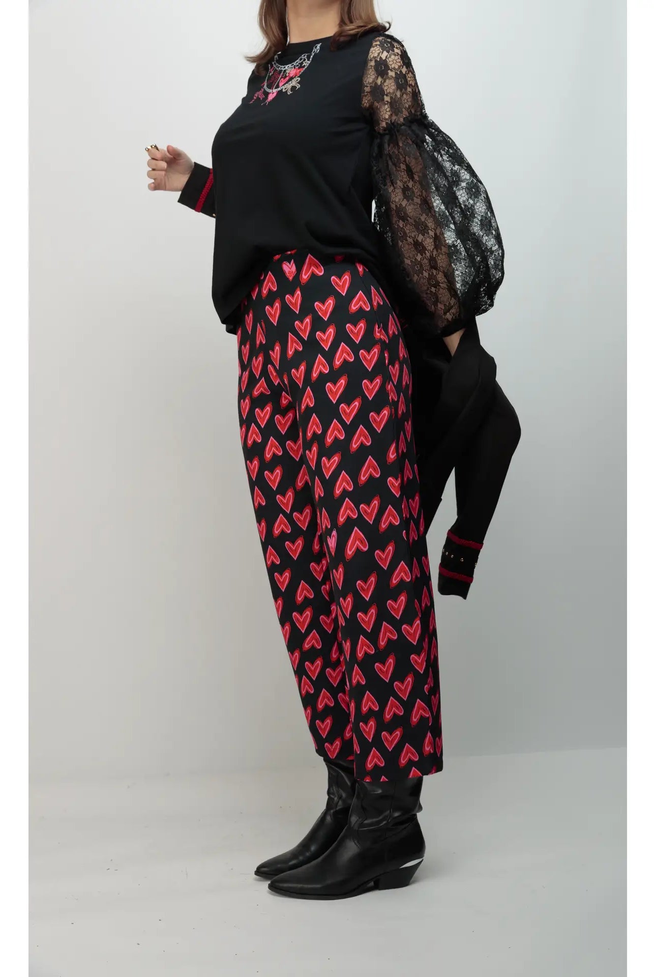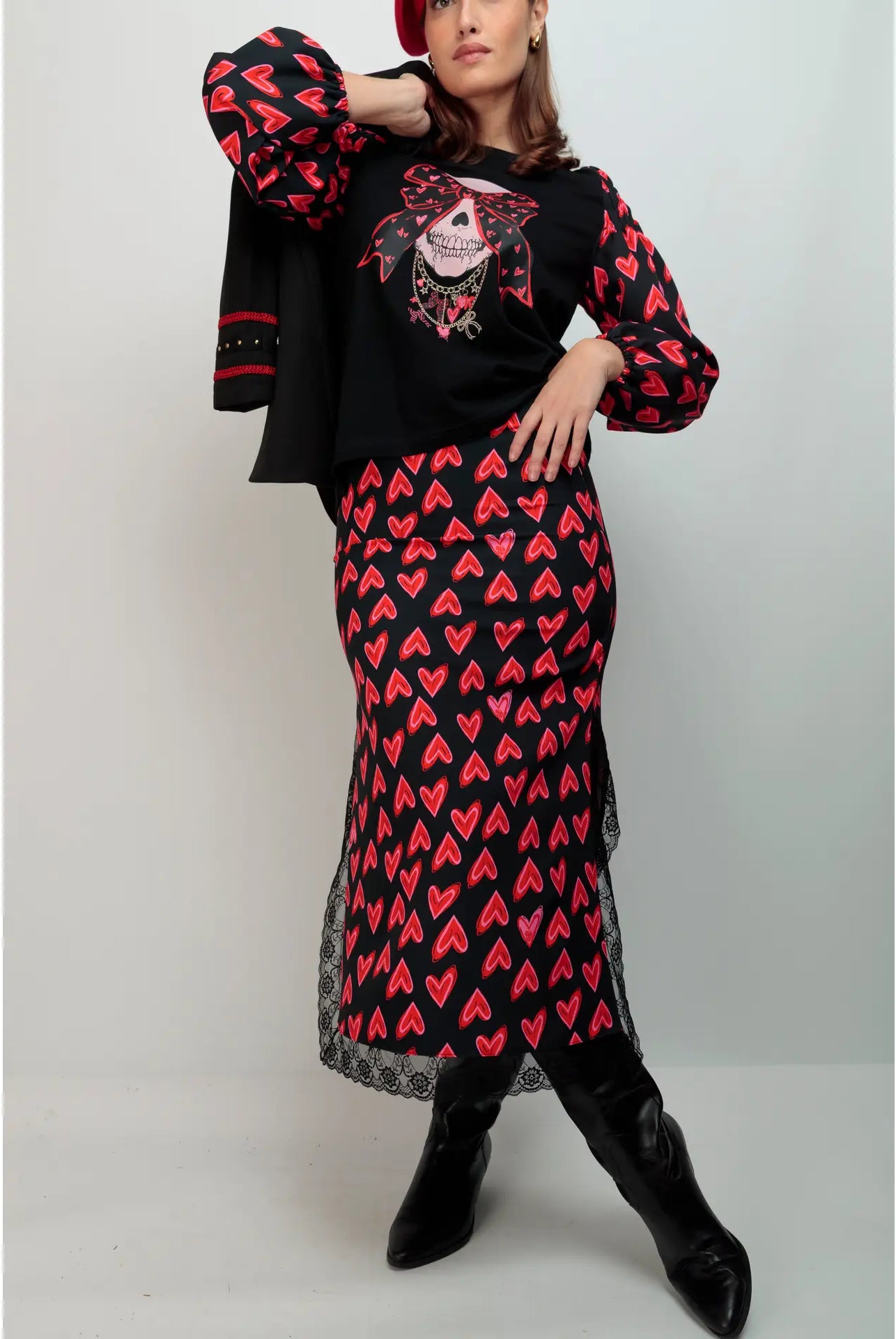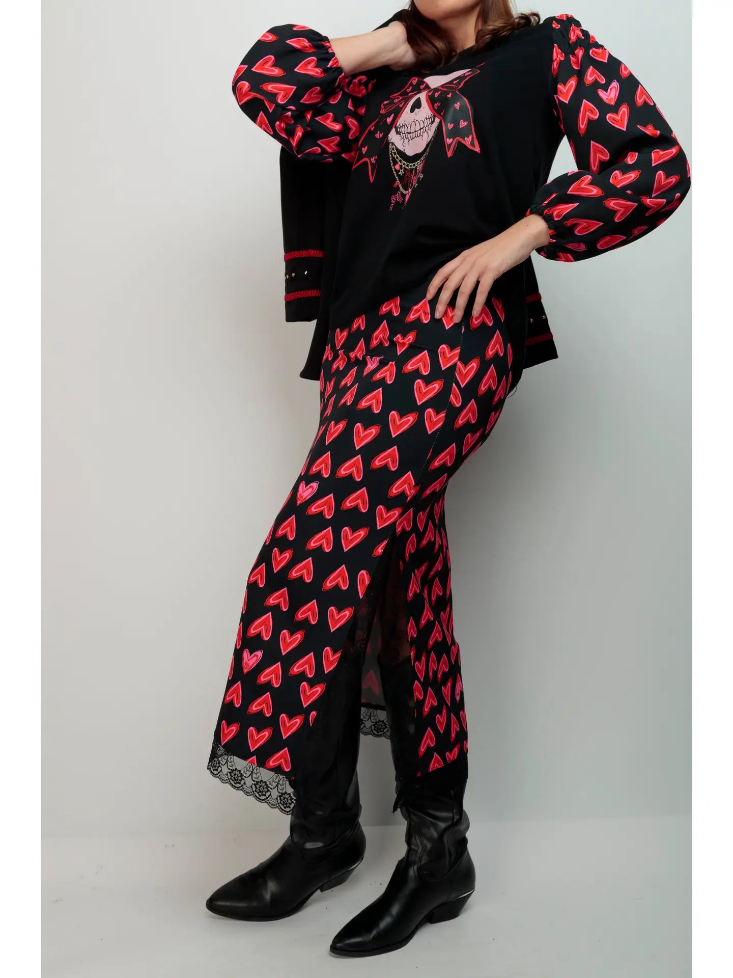 🔹 Details marquants : Revers classiques, poches de plastron fonctionnelles, imprime coeurs rouges sur fond noir, message contraste “Love Me More” au dos
