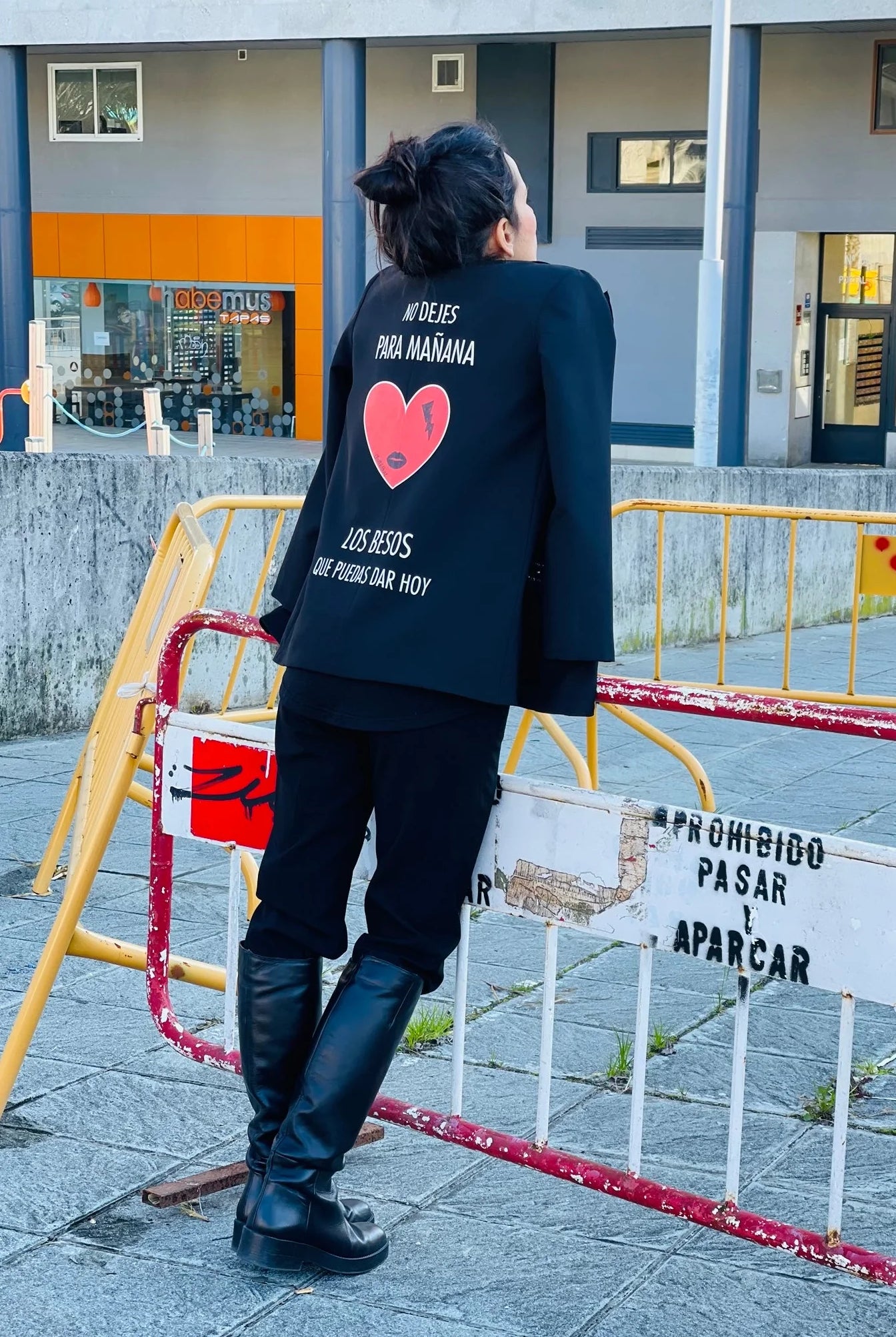 Ce blazer imprime affirme une allure contemporaine avec une coupe structuree et un motif graphique fort. Concu pour sublimer la silhouette tout en restant confortable, il se distingue par son message au dos et sa fabrication soignee en Espagne.