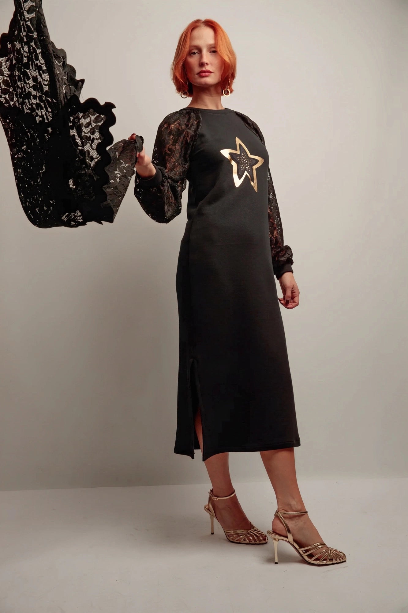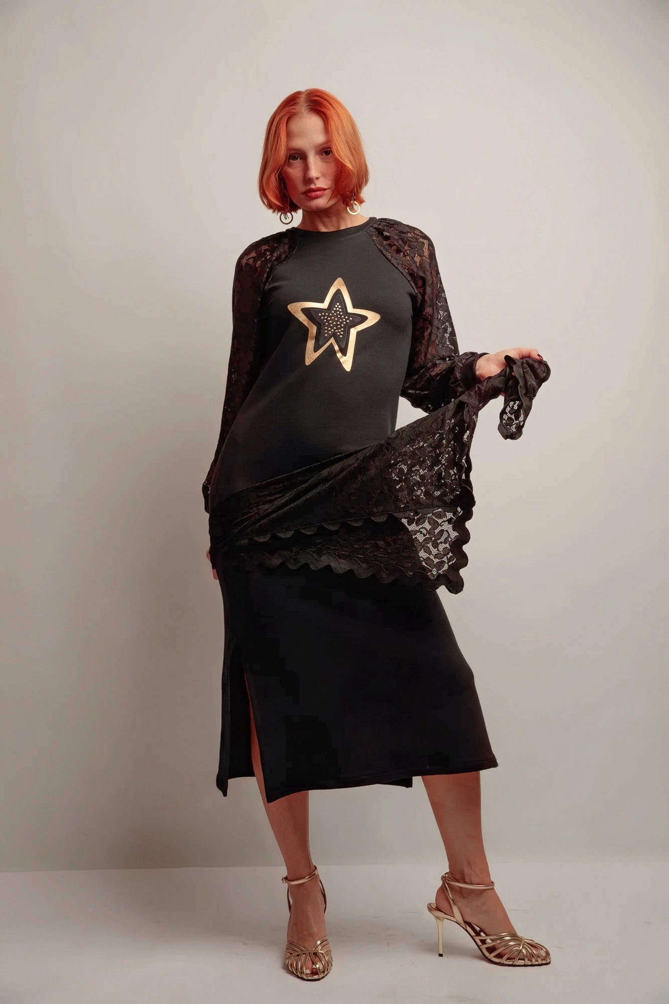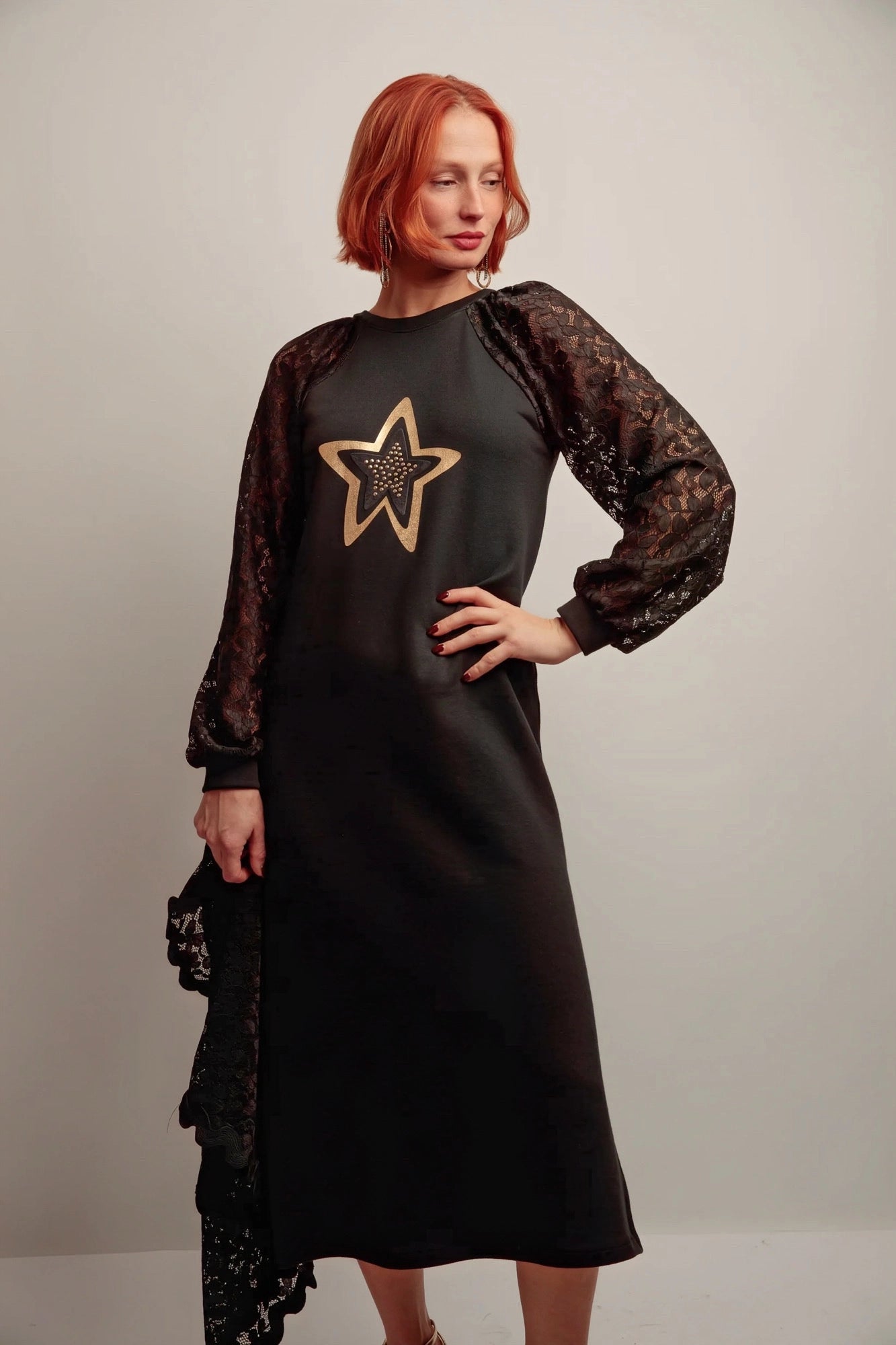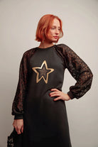 Une robe longue au charme moderne, où la féminité rencontre la touche graphique. Son mélange de maille douce et de dentelle raffinée sublime la silhouette, tandis que l’étoile dorée sur le devant attire la lumière avec élégance.