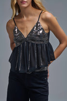 Apportez une touche lumineuse à vos tenues avec ce top noir orné de paillettes, pensé pour offrir éclat et fluidité. Sa ligne sans manches met en valeur la silhouette tout en assurant un porté agréable.