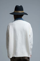Cardigan en tricot gaufré blanc avec intérieur en denim épais bleu