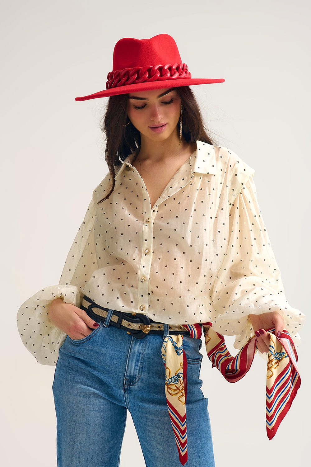 Chemisier en soie à pois ivoire avec manches ballon et boutons dorés