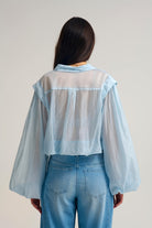 Chemisier en soie Tencel bleu avec manches ballon et boutons en nacar