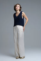 🔹 Coupe / Forme : gilet croisé à encolure dégagée, bretelles épaisses, ajustement décontracté