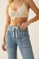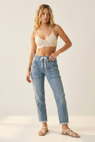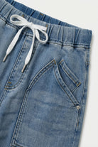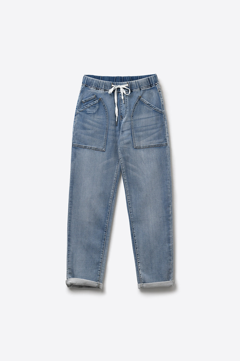 Jean denim jogger bleu clair femme taille cordon coupe decontractee