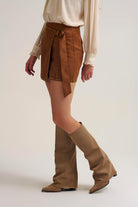 Jupe portefeuille mini camel cloutée avec ceinture détaillée