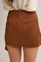 Cette jupe portefeuille mini camel structure la silhouette grâce à sa coupe enveloppante et sa matière effet suède. Les détails cloutés et la ceinture intégrée apportent du relief tout en restant faciles à porter au quotidien ou pour une tenue plus travaillée.