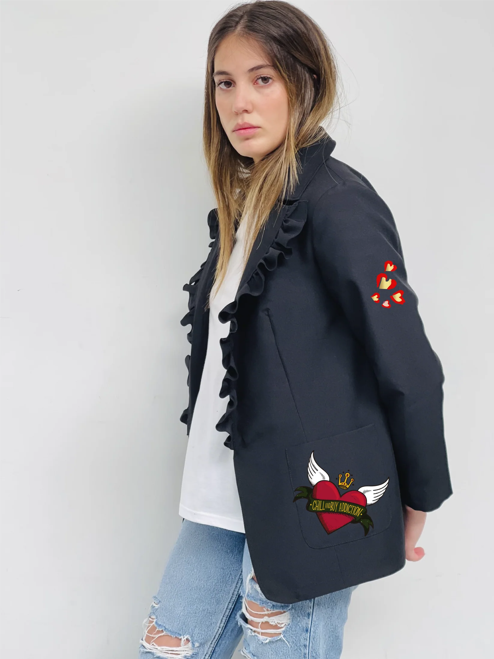 🔹 Details marquants : Col a revers et decollete en V, poches plaquees a l’avant, volants decoratifs sur la solape et imprimé sur la manche, le dos et le devant