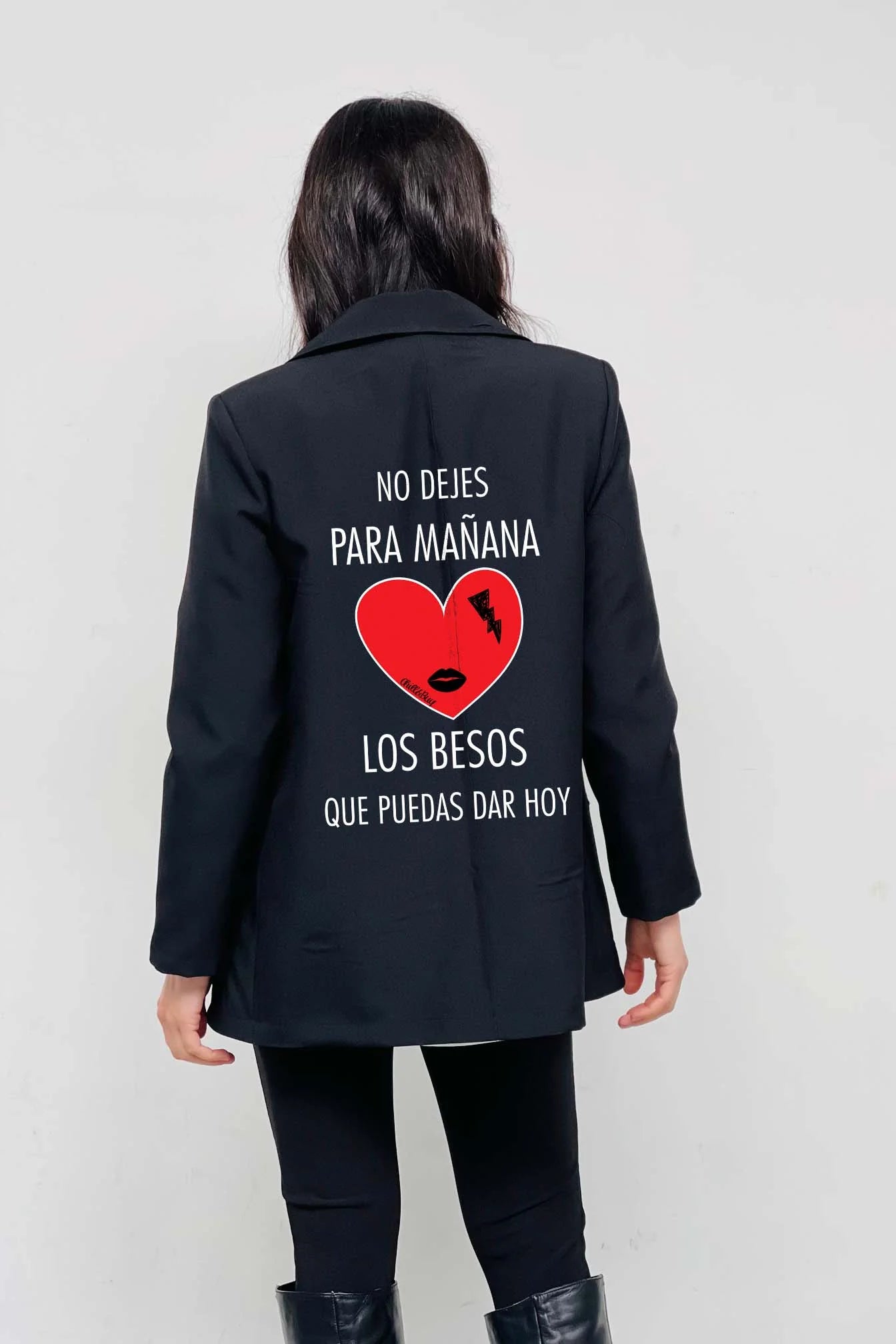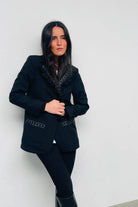 Ce blazer noir revisite un grand classique avec une touche graphique forte au dos. Sa coupe structurée, associée à des détails métalliques discrets, en fait une pièce affirmée qui apporte du caractère à vos silhouettes tout en restant facile à porter.