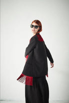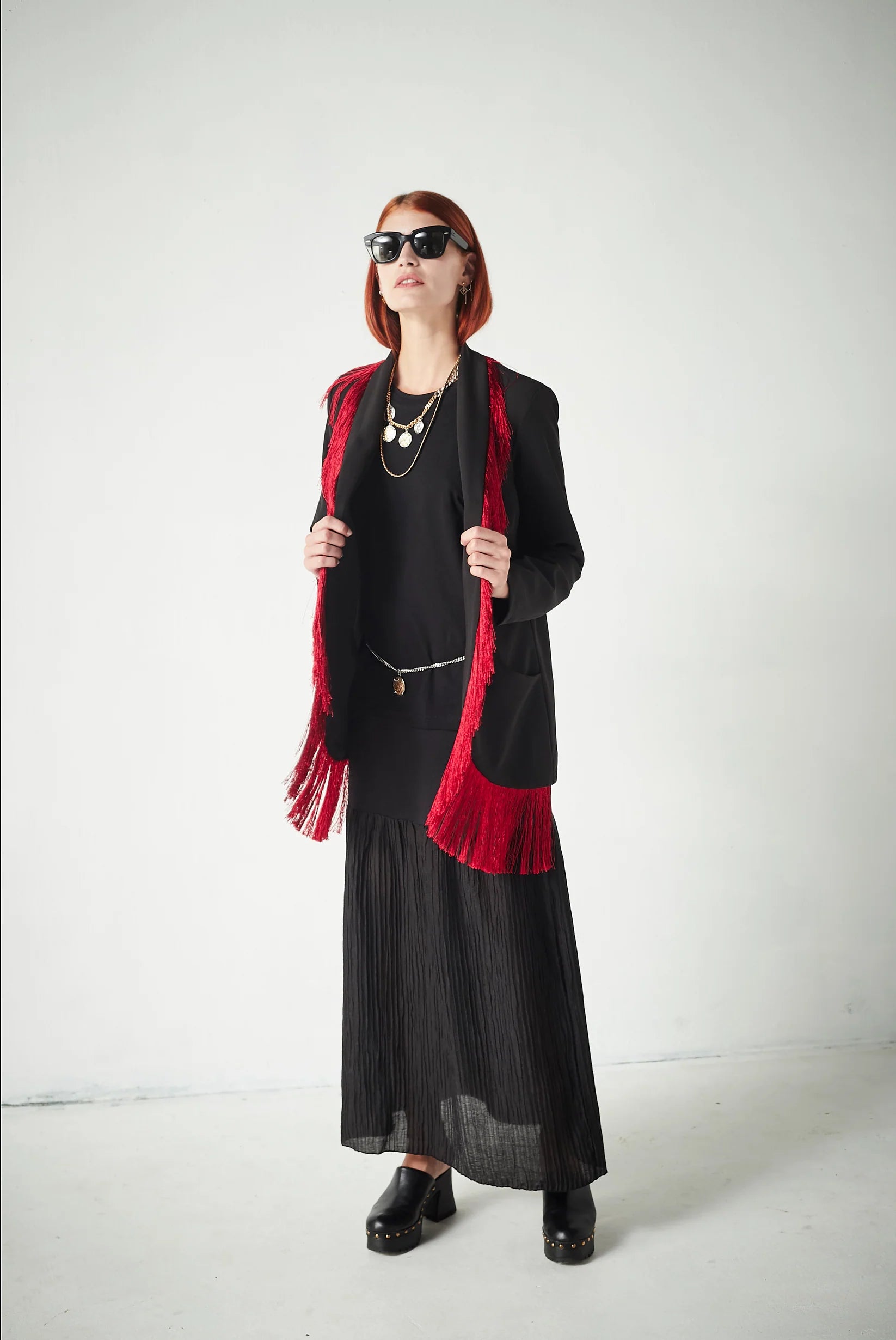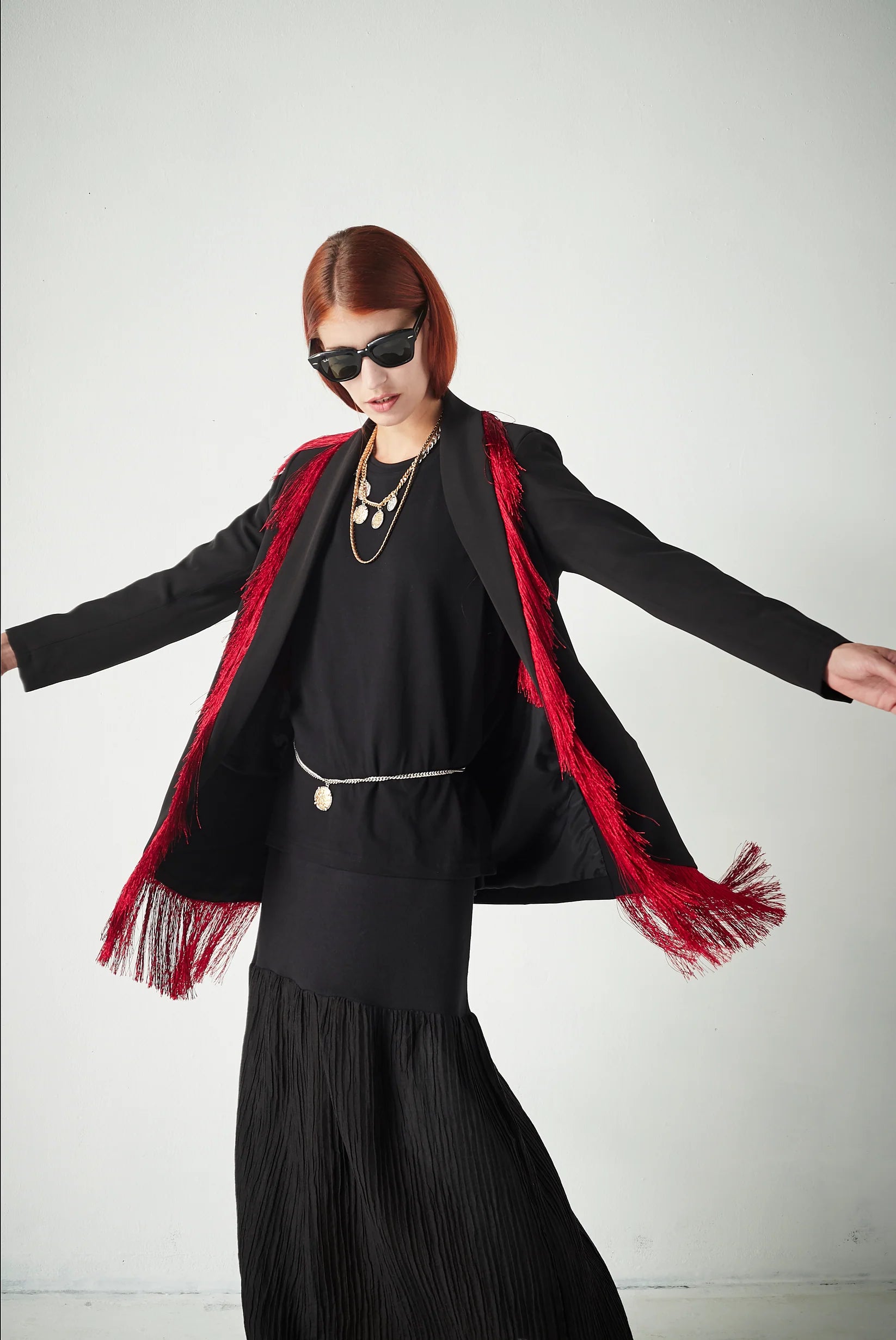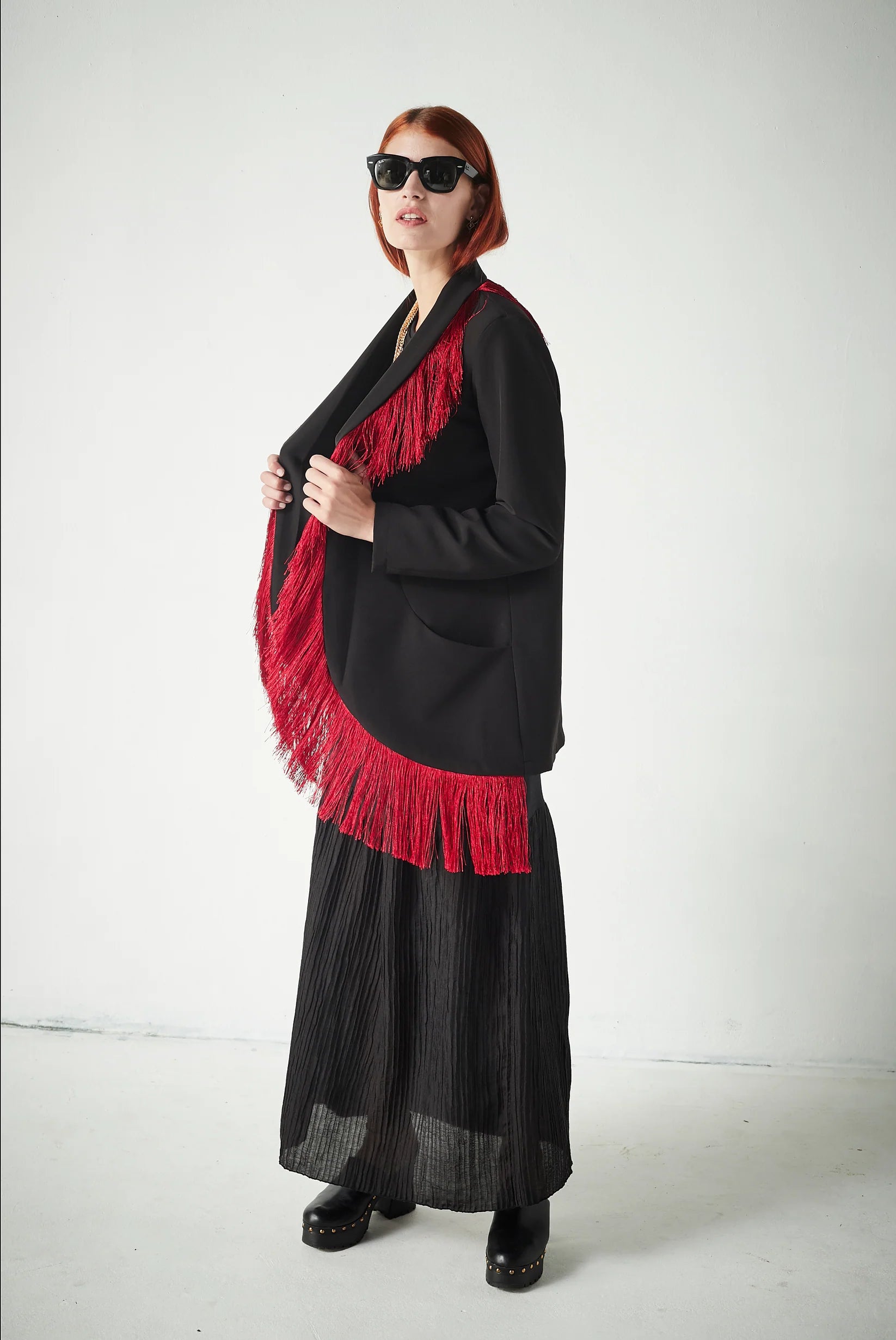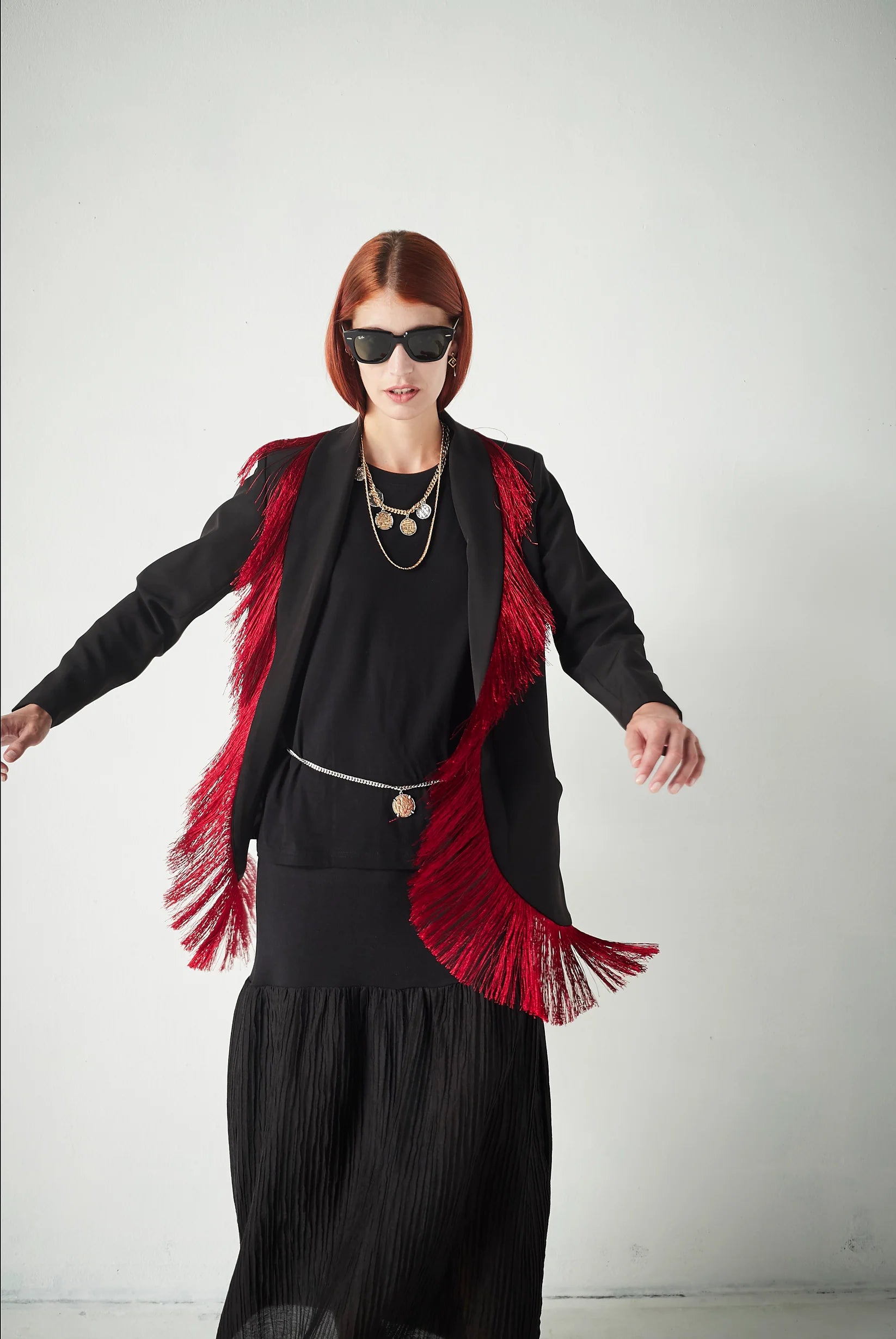 Un blazer a la coupe impeccable qui revisite le smoking avec une touche originale. Ses franges rouges contrastantes sur le col, les manches et le haut du dos créent un jeu de mouvement élégant et inattendu.
