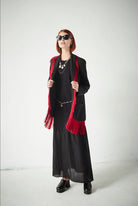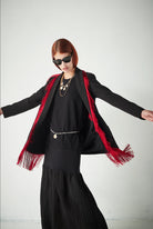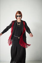 🔹 Details marquants : Franges rouges longues sur le col et le haut du dos, poches extérieures et finition intérieure soigneuse