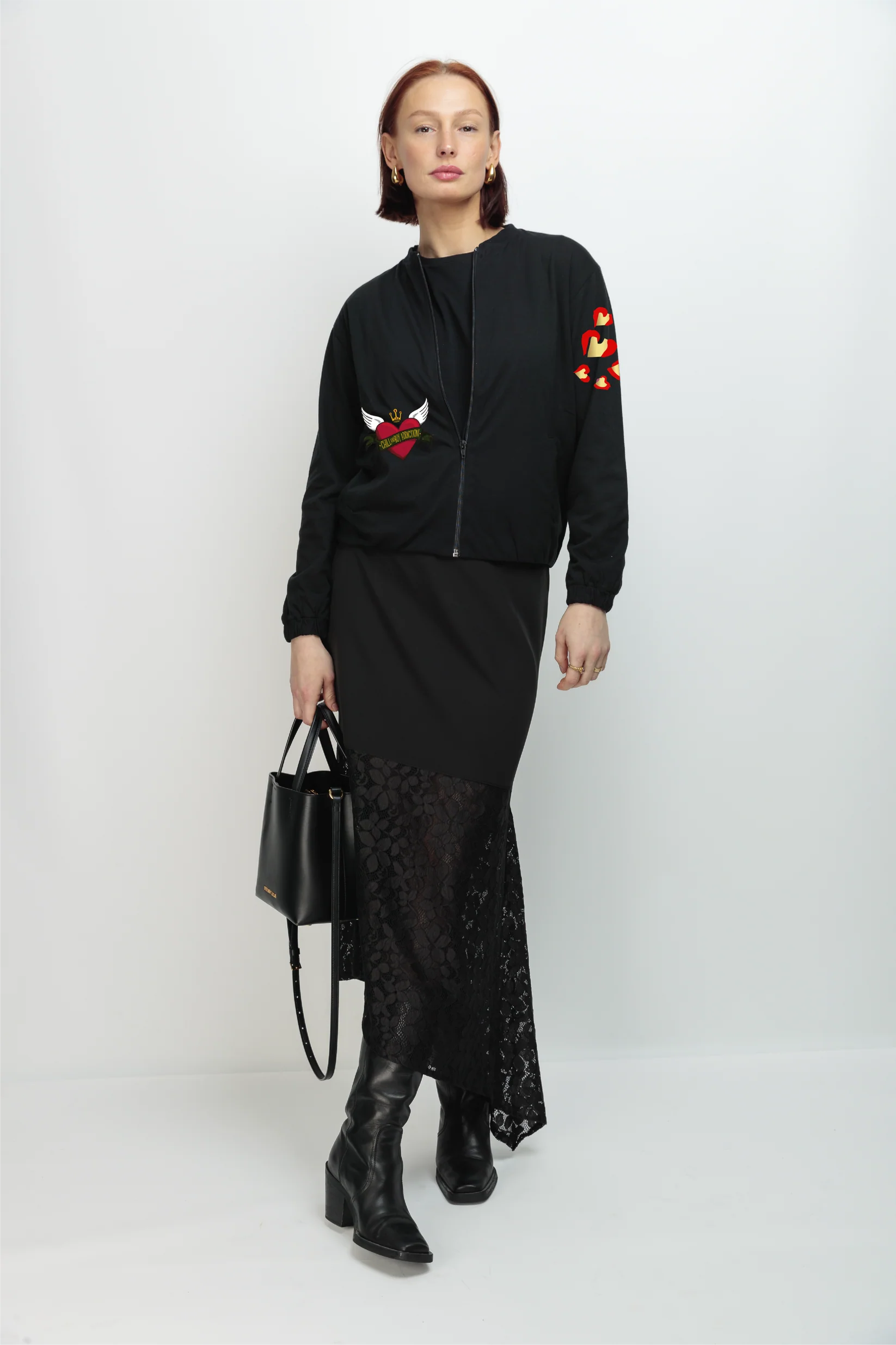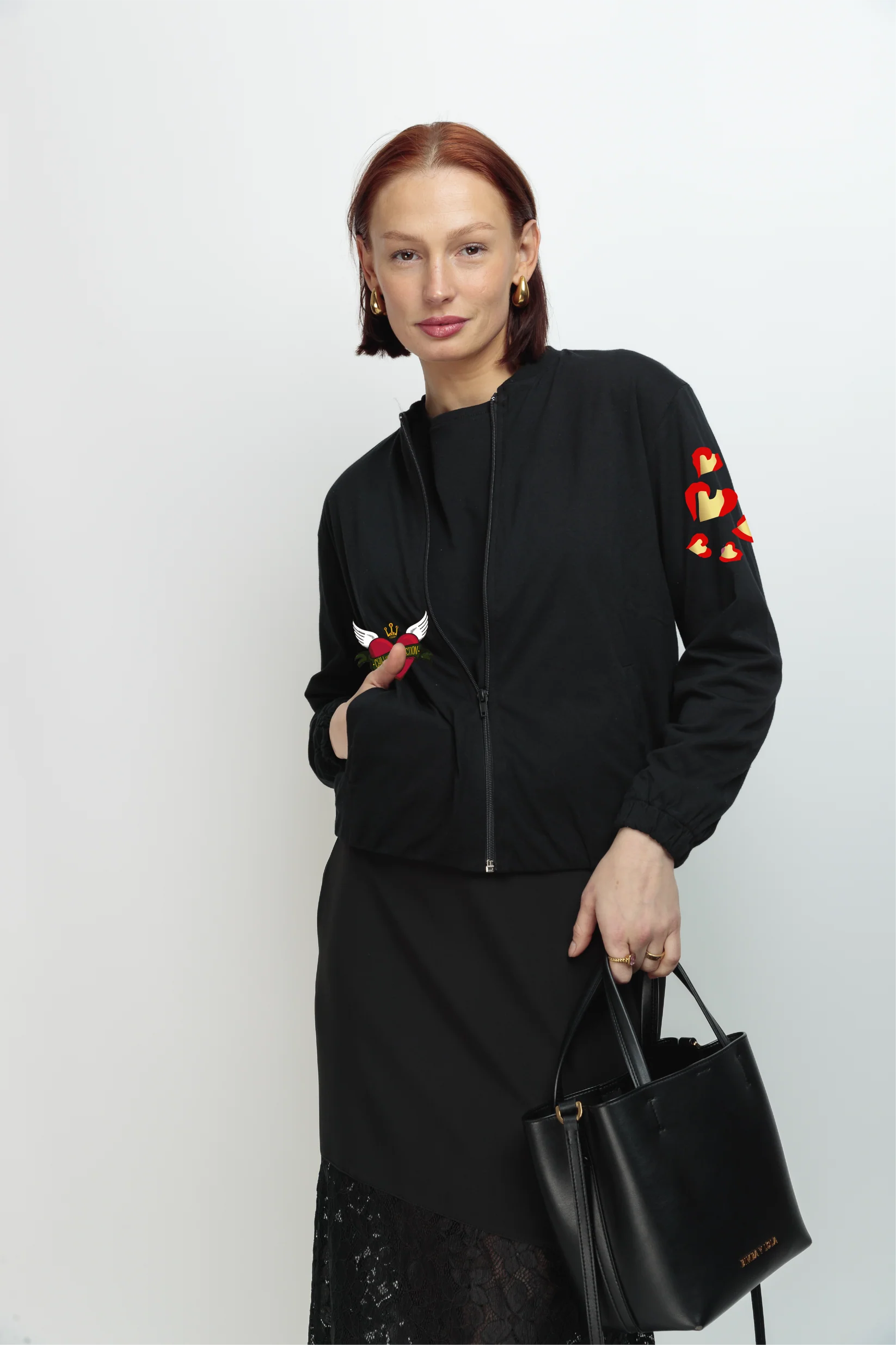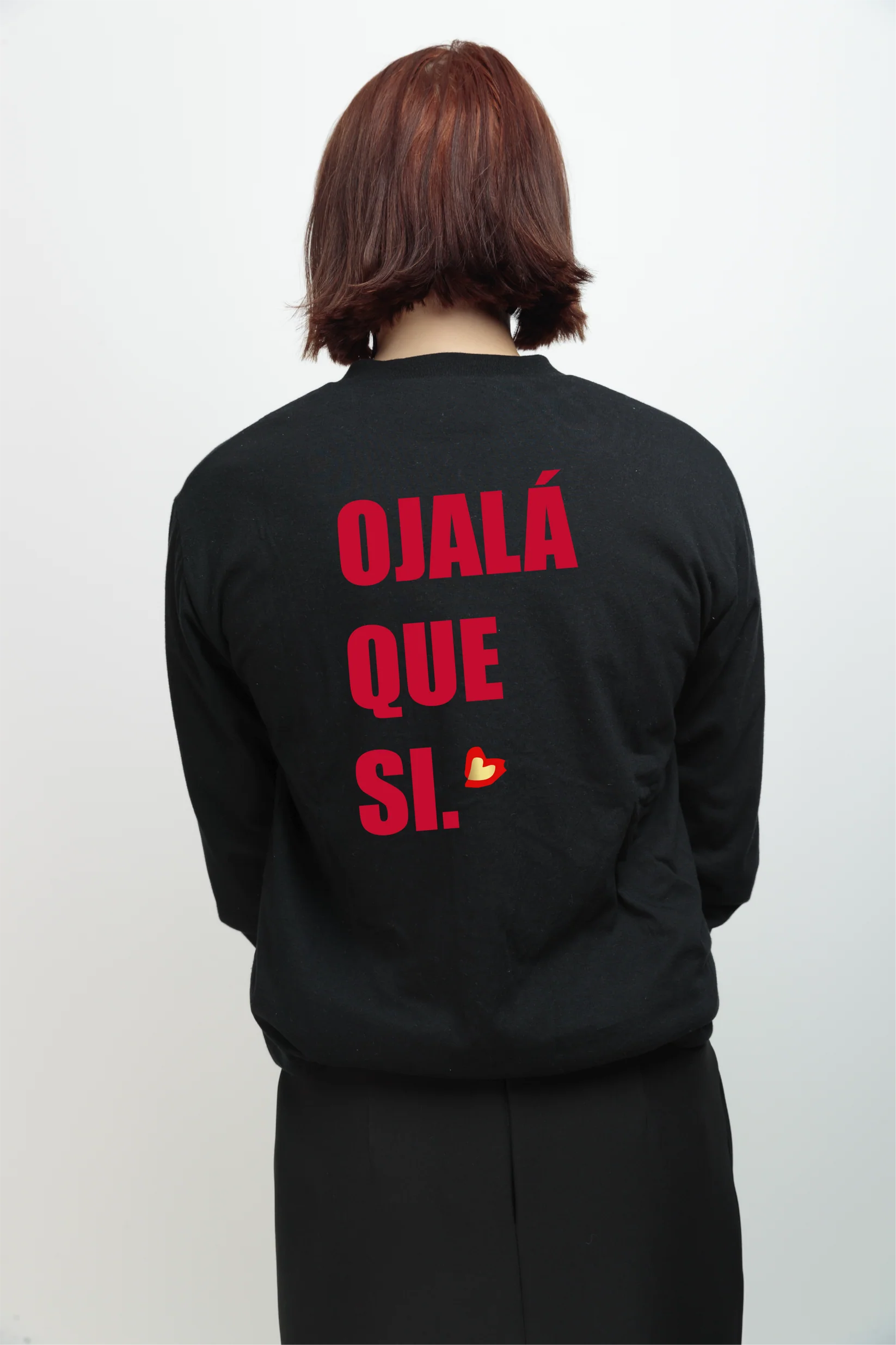 🔹 Détails marquants : Inscription « Ojalá que sí » au dos, motifs cœurs et ailes brodées sur l'avant et la manche, poches latérales discrètes