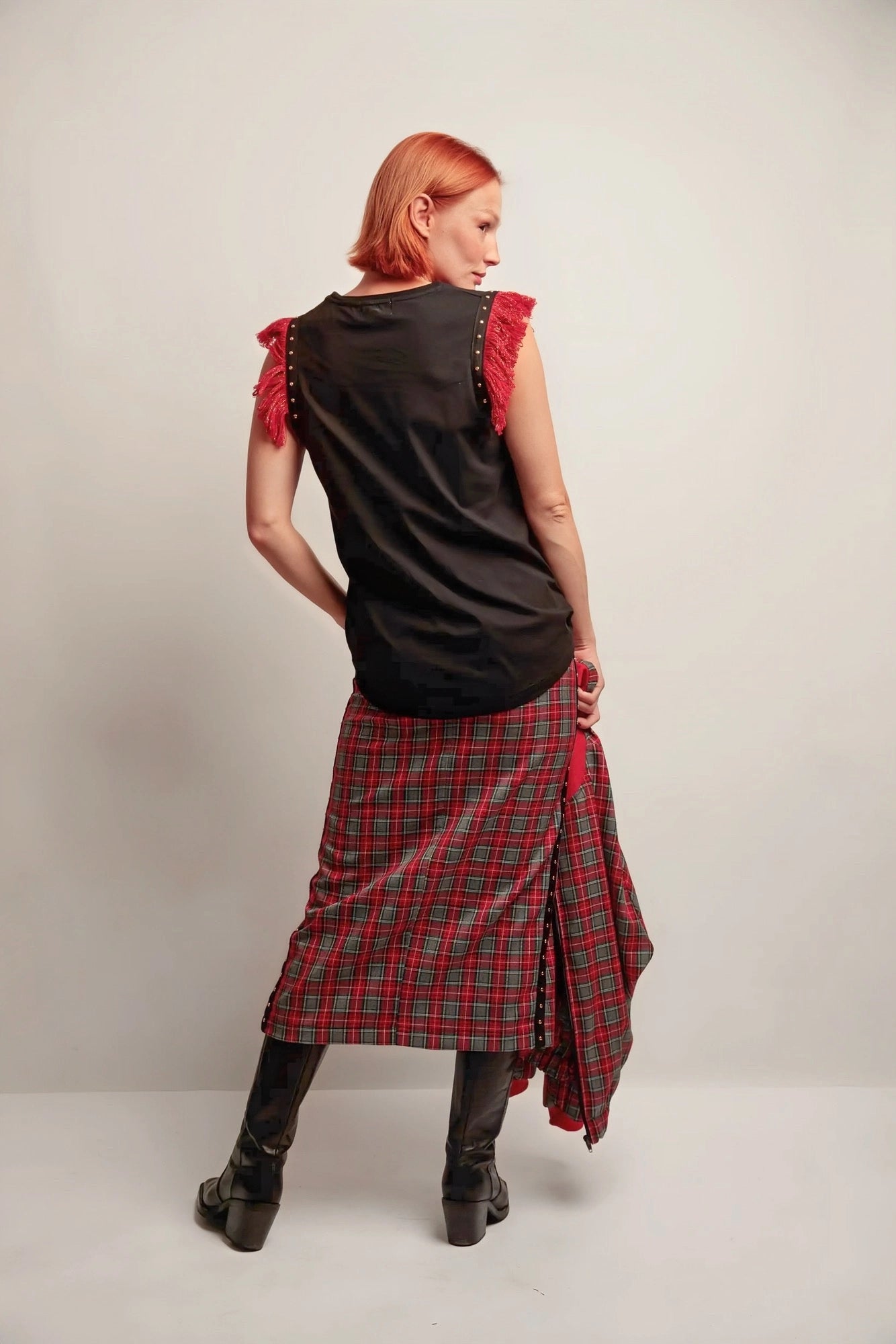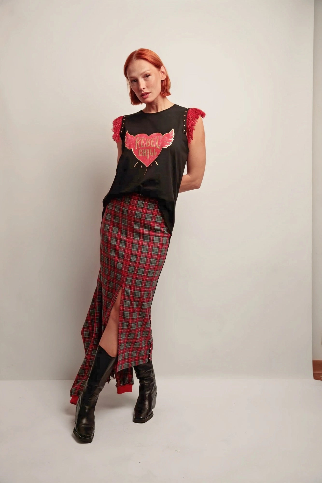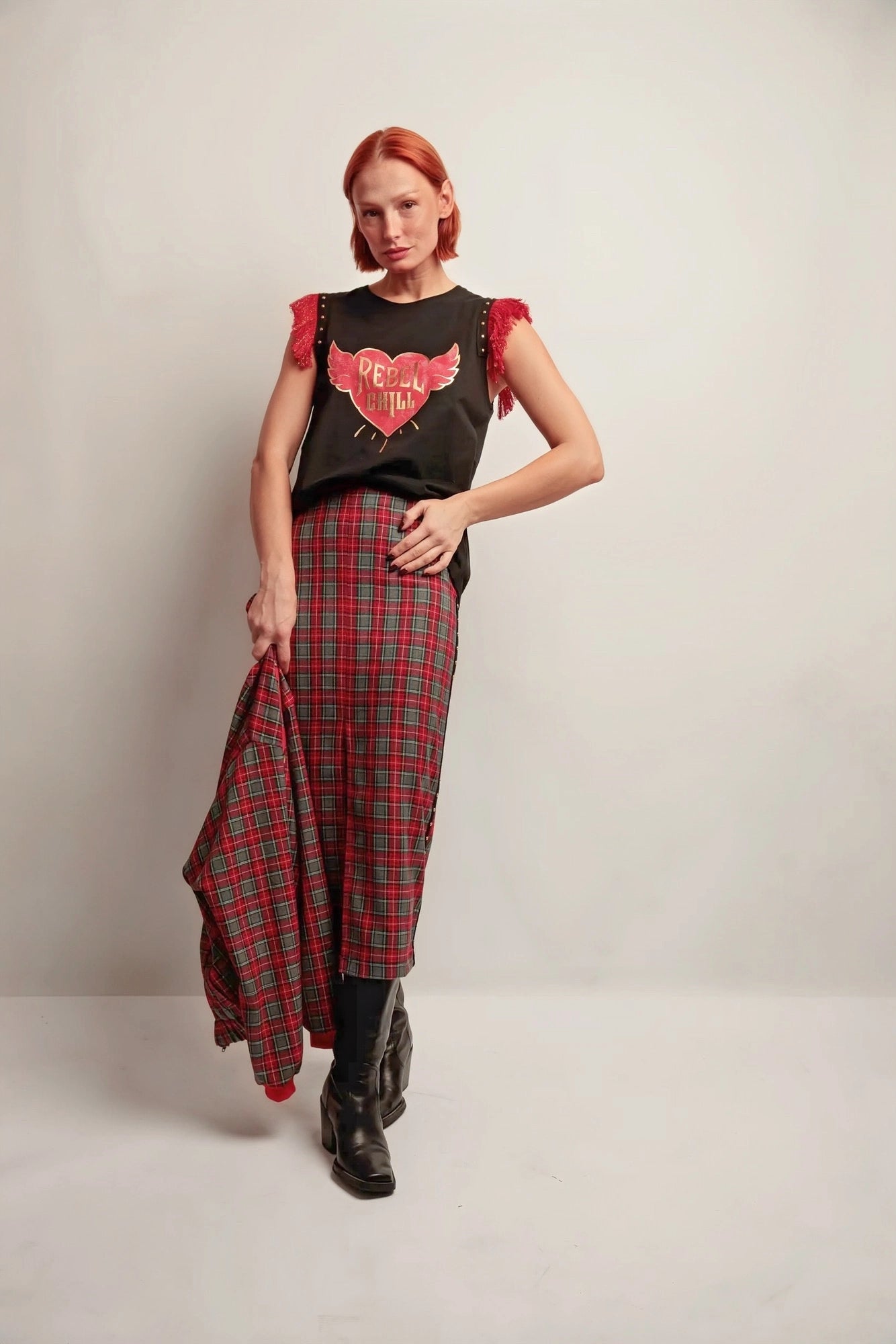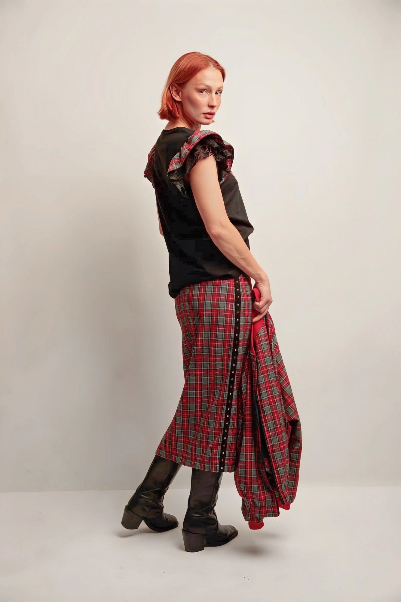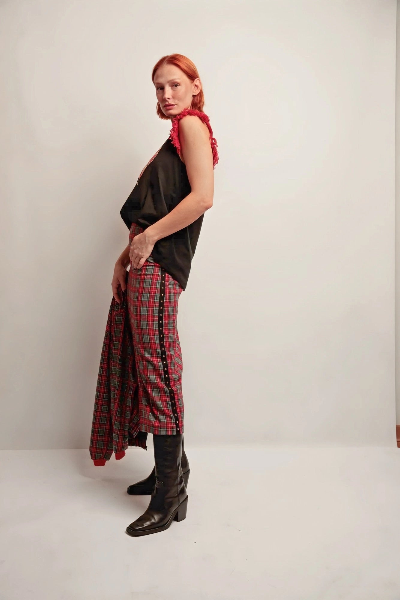 Une jupe droite élégante au motif tartan, conçue pour sublimer la silhouette avec modernité. Sa ligne épurée et ses détails métalliques dorés en font une pièce intemporelle à fort caractère.