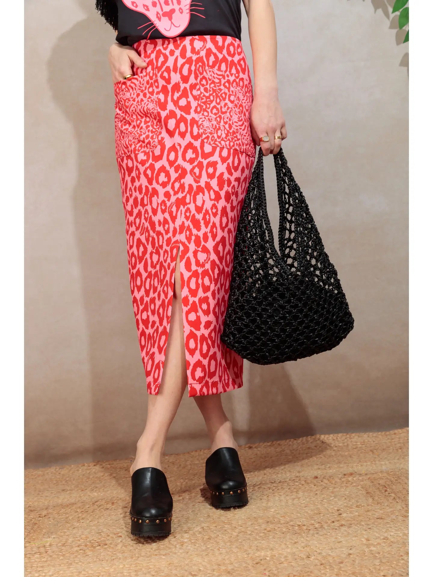 🔹 Coupe / Forme : Coupe droite longueur midi avec fente frontale pour une allure élancée