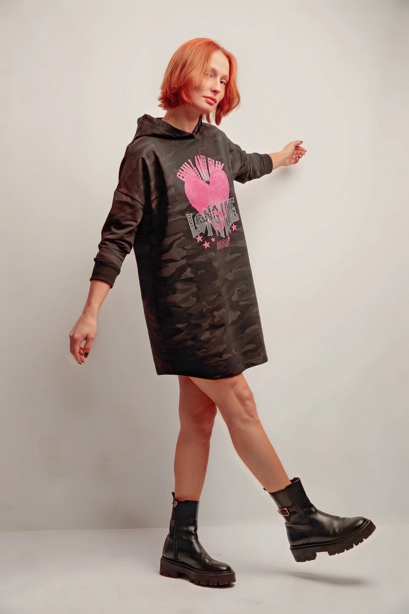 Alliez confort et style avec la Robe Capuche Cœur Live, une pièce à l’esprit urbain et féminin. Son tissu camouflage aux nuances de noir et de gris, rehaussé d’un intérieur doux en molleton, en fait la compagne idéale des journées décontractées.