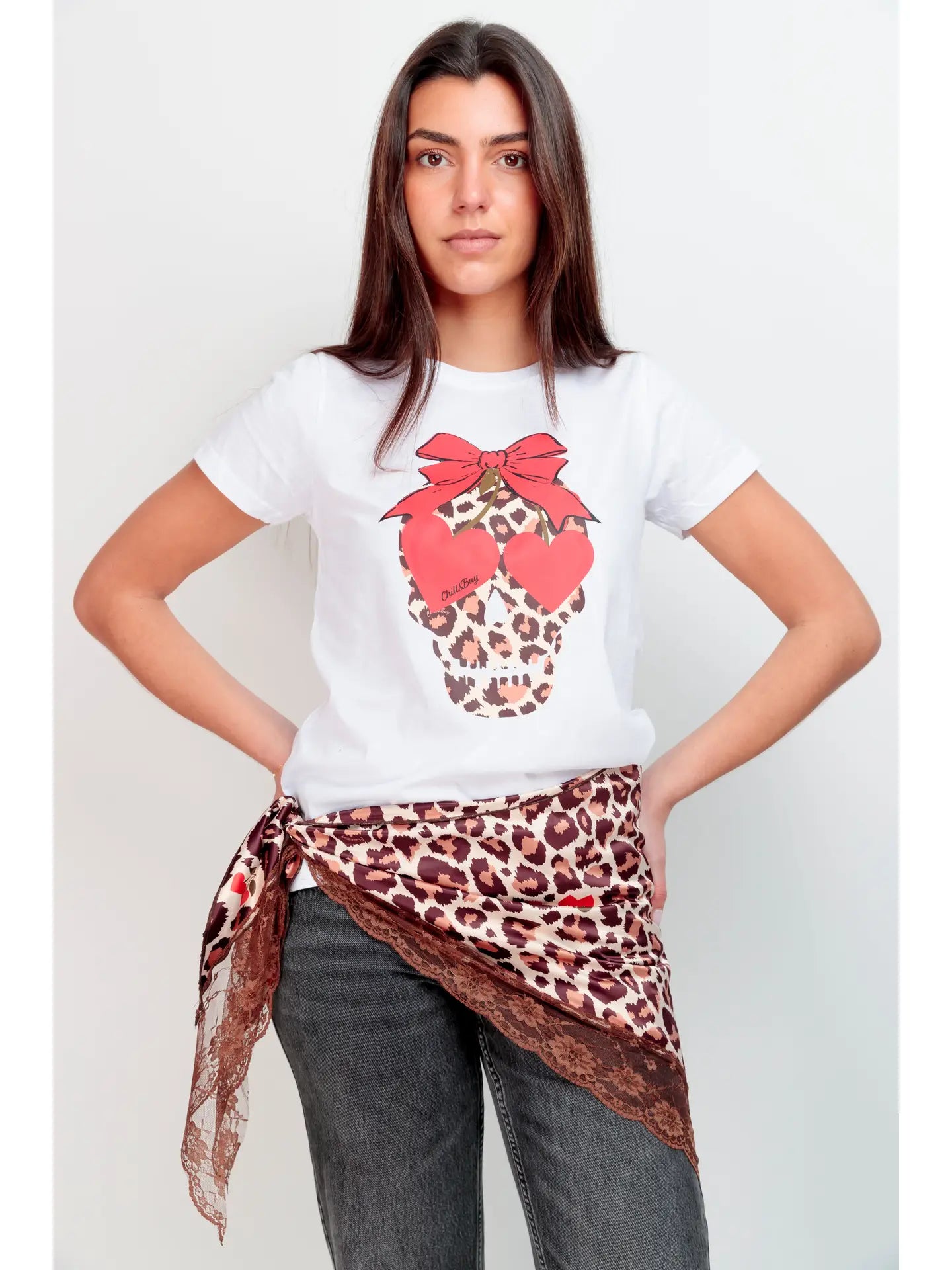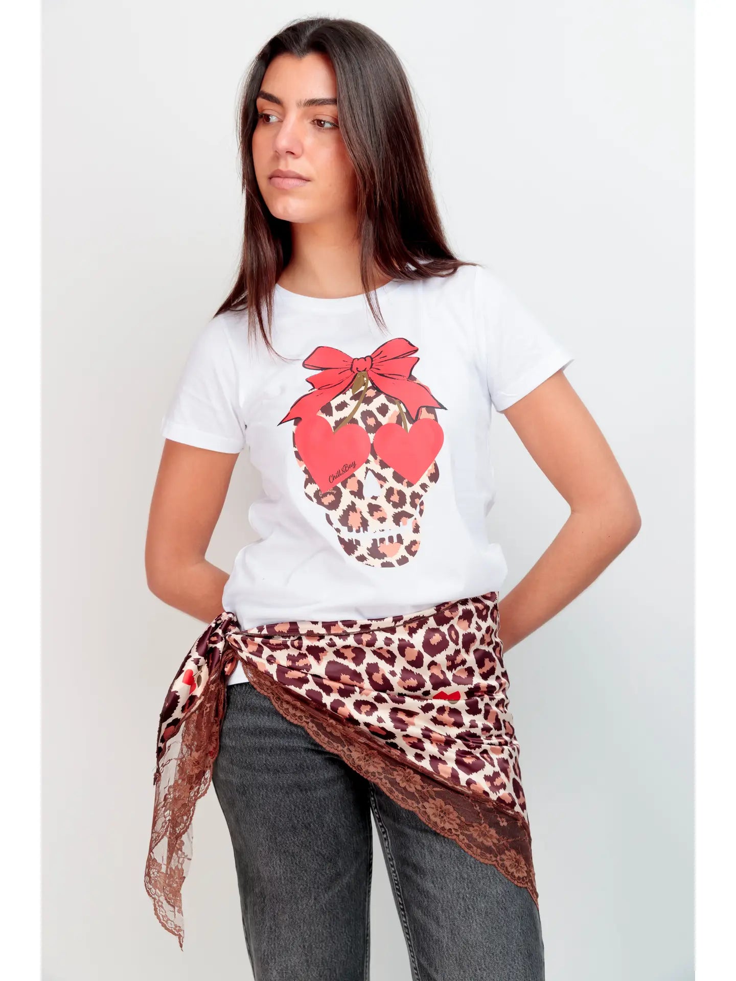 Details marquants : motif frontal avec imprime leopard, noeud et coeurs en contraste pour un effet visuel structure.