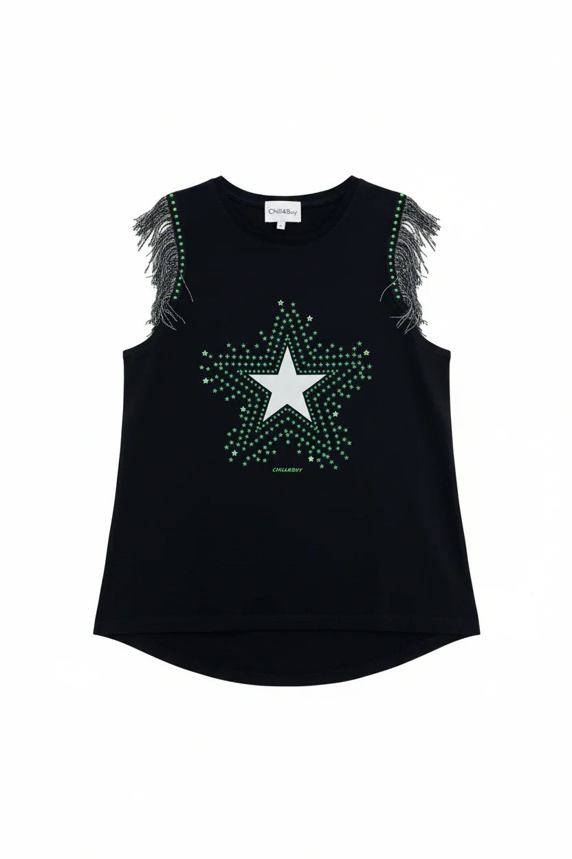 T-shirt femme noir franges lurex et etoile imprimee clous verts