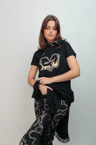 Confortable et facile à styliser, ce t-shirt noir se distingue par son imprimé cœur doré et son message graphique sur le devant. Une pièce du quotidien qui apporte une touche visuelle affirmée tout en restant agréable à porter.