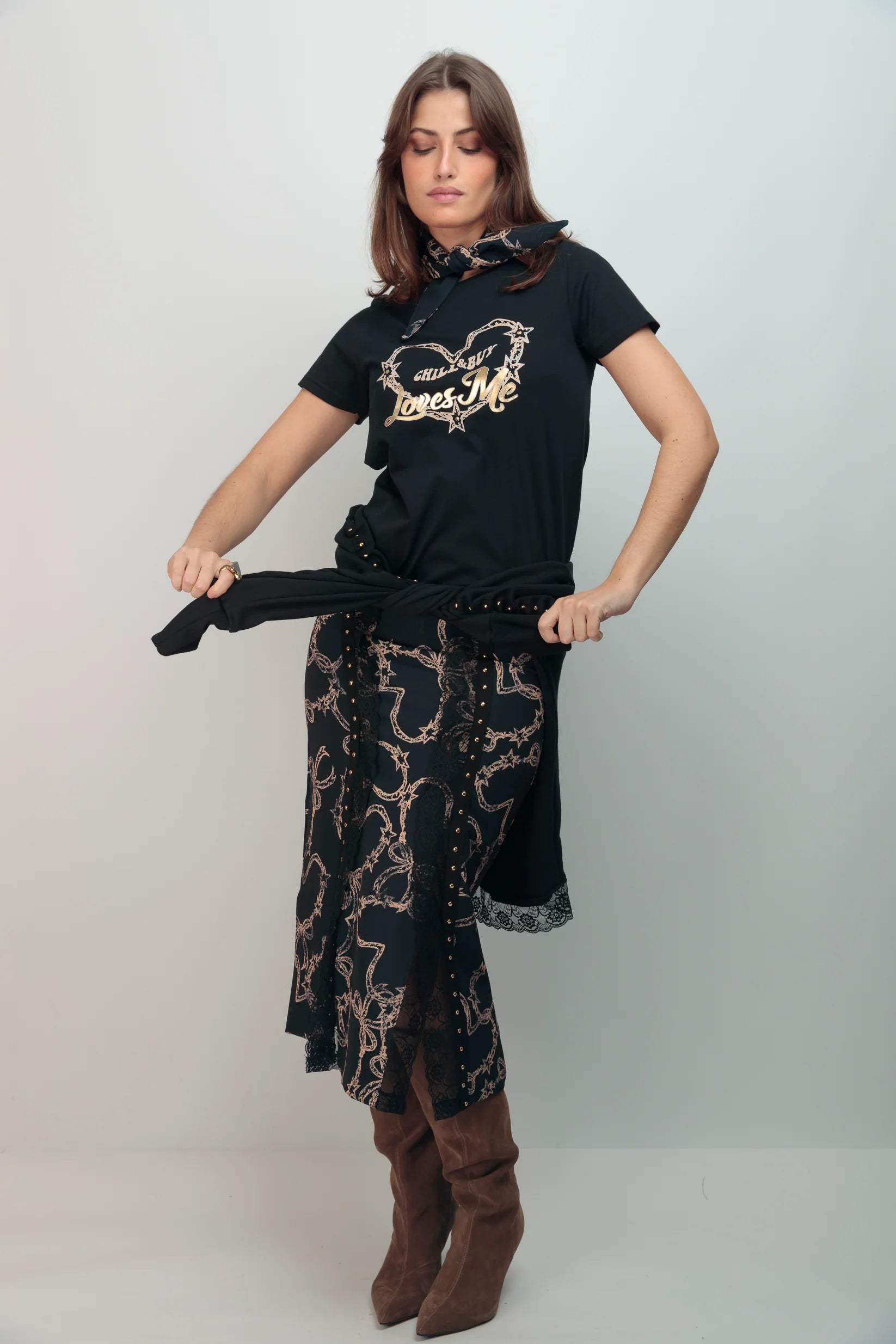 🔹 Détails marquants : Imprimé cœur avec inscription « Loves Me » en finition dorée, col rond classique, manches courtes