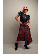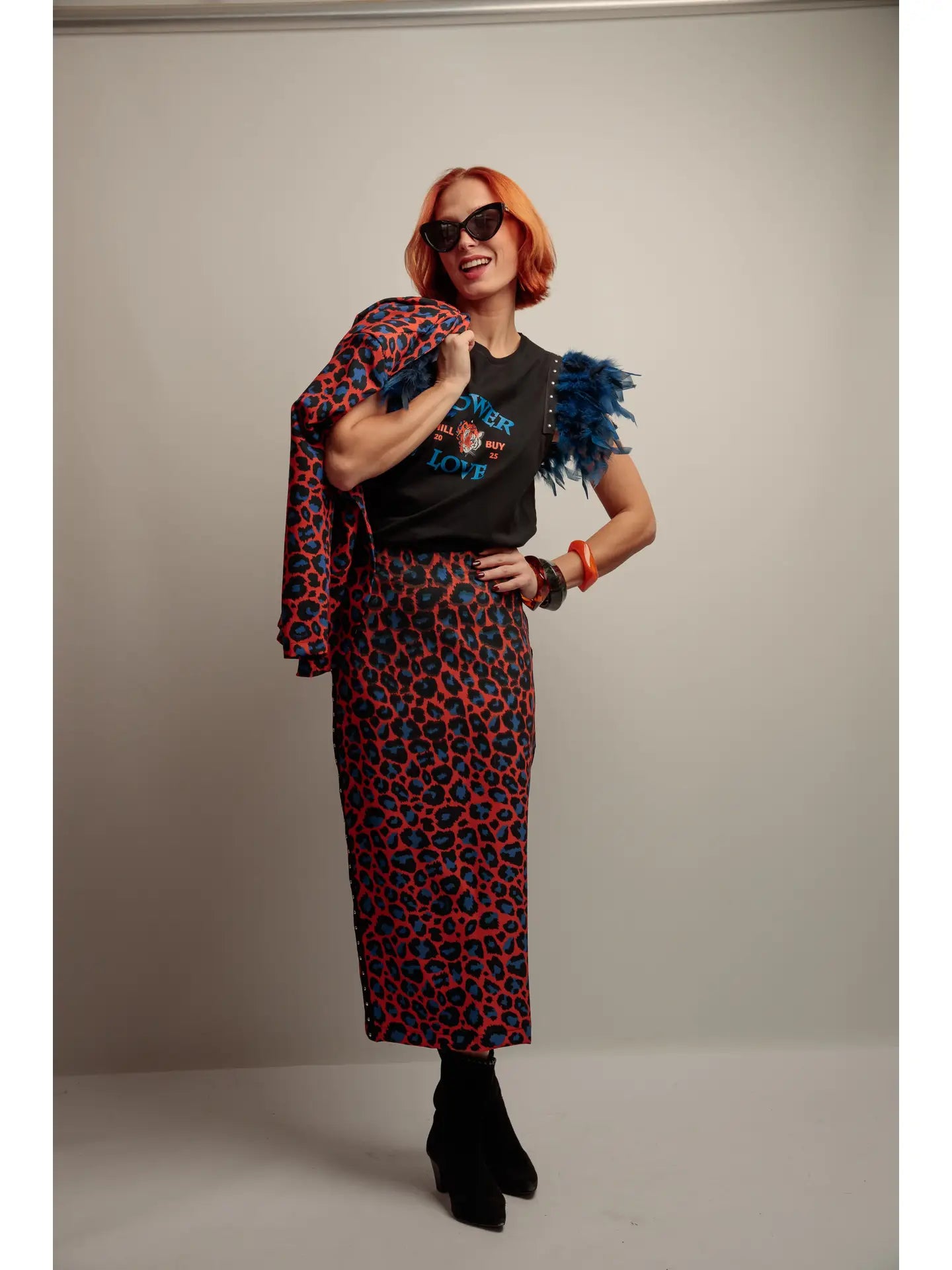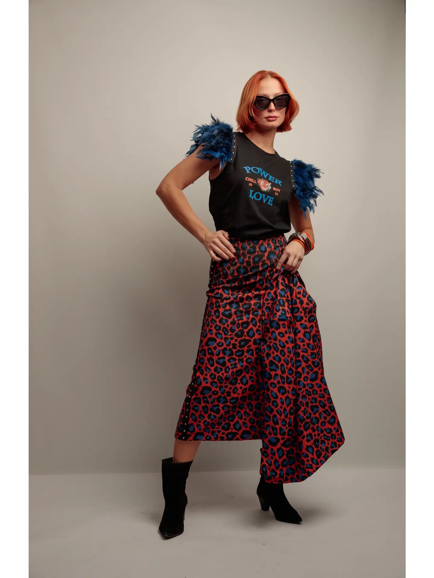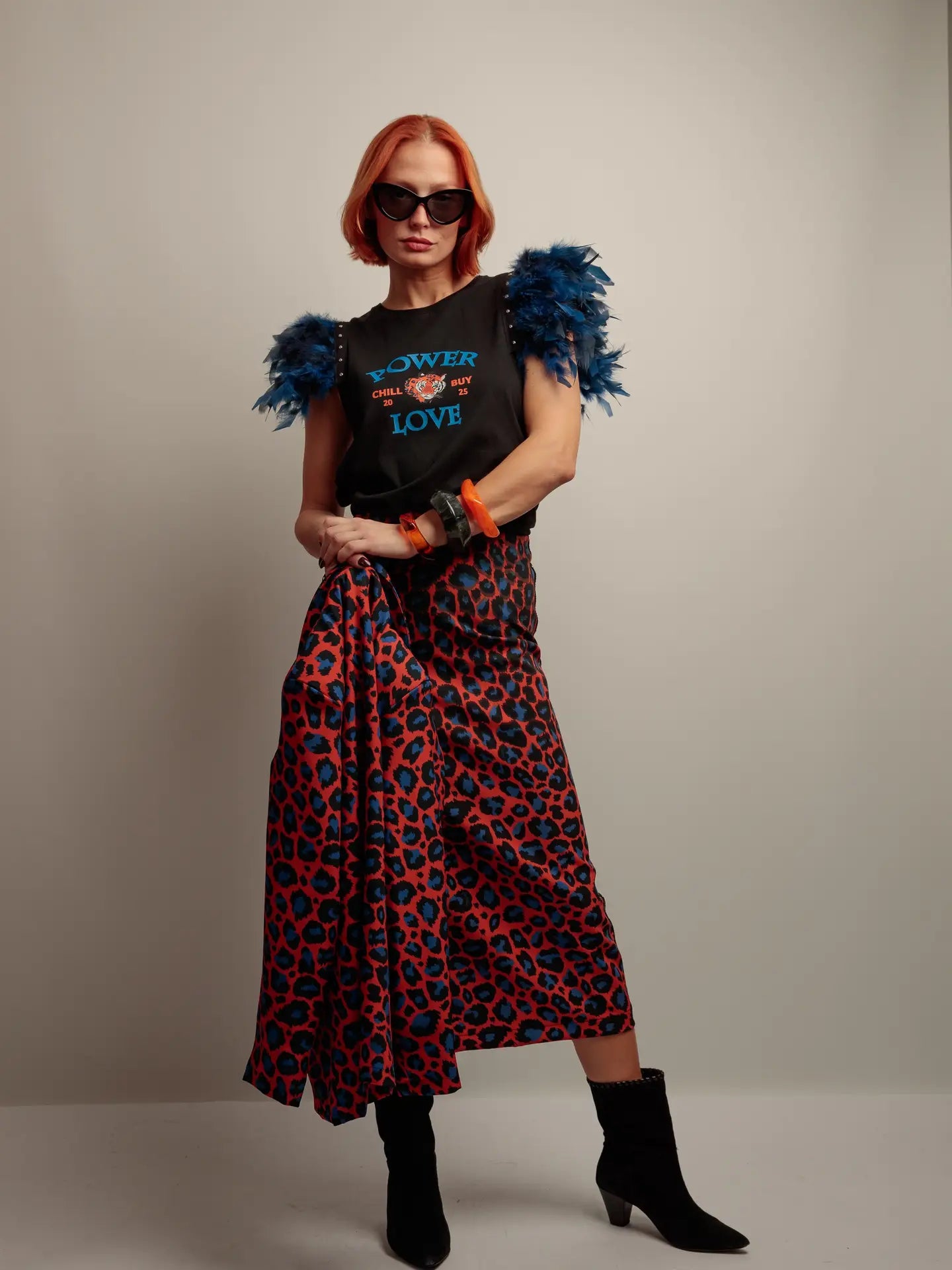 Ce t shirt en coton noir apporte une energie visuelle immediate avec ses plumes bleues placees sur les epaules. Sa coupe evasee et son ourlet asymetrique offrent un tombé fluide, tandis que l’impression contrastee ajoute un caractere affirmé, facile a intégrer dans un look quotidien.