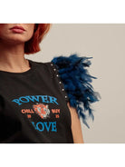 🔹 Details marquants : Plumes bleues aux epaules, bande de clous argentés, col rond, motif imprime frontal, confection realisee a Vigo