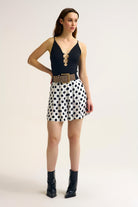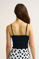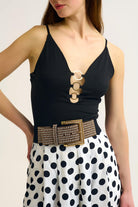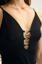 🔹 Details marquants : Col V profond, trois anneaux decoratifs en or noir, bretelles spaghetti ajustables
