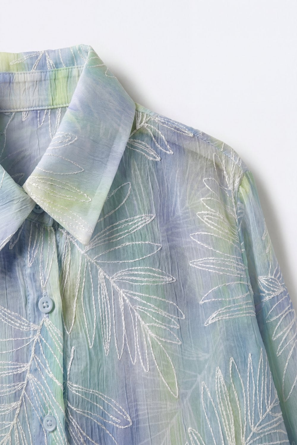 🔹 Détails marquants : Imprimé feuilles blanches, col classique, patte de boutonnage, transparence subtile