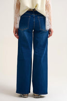Ce jean en denim à jambe large associe une coupe confortable à des détails en strass placés sur le devant pour structurer la silhouette. Sa taille haute et son denim stretch offrent une tenue agréable tout au long de la journée, tout en apportant une touche visuelle distinctive.