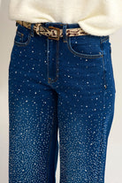 Jeans denim jambe large avec strass devant femme