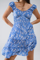 Robe courte bleue à imprimé floral blanc et taille élastique