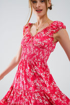 Robe courte rouge à imprimé floral blanc et taille élastique