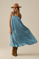Robe longue à bretelles volantées en tissu tencel bleu clair
