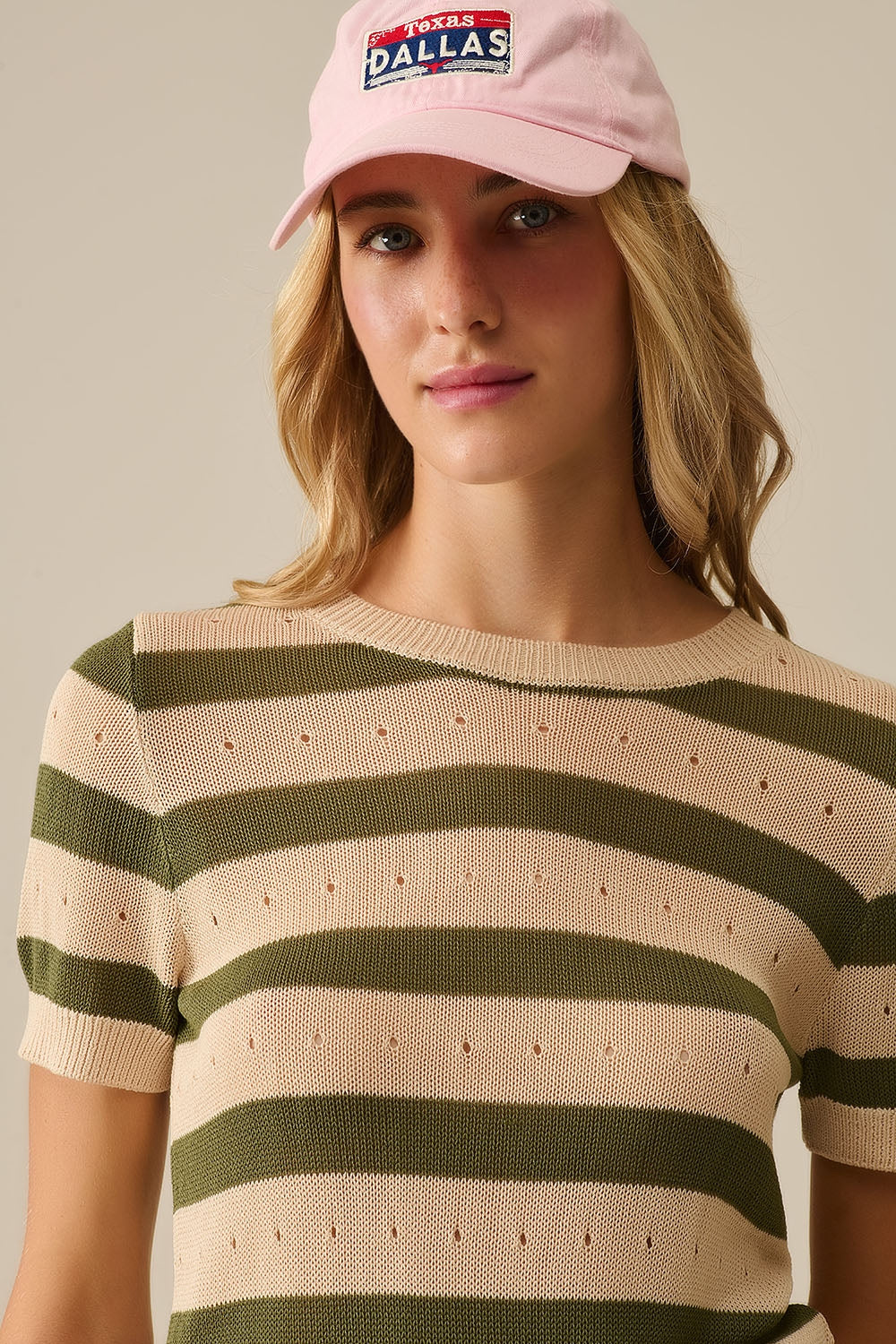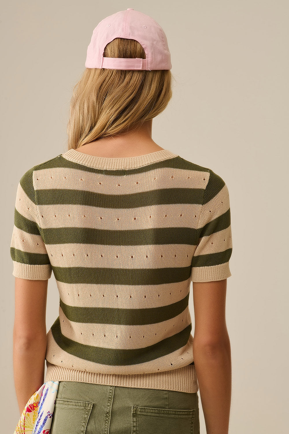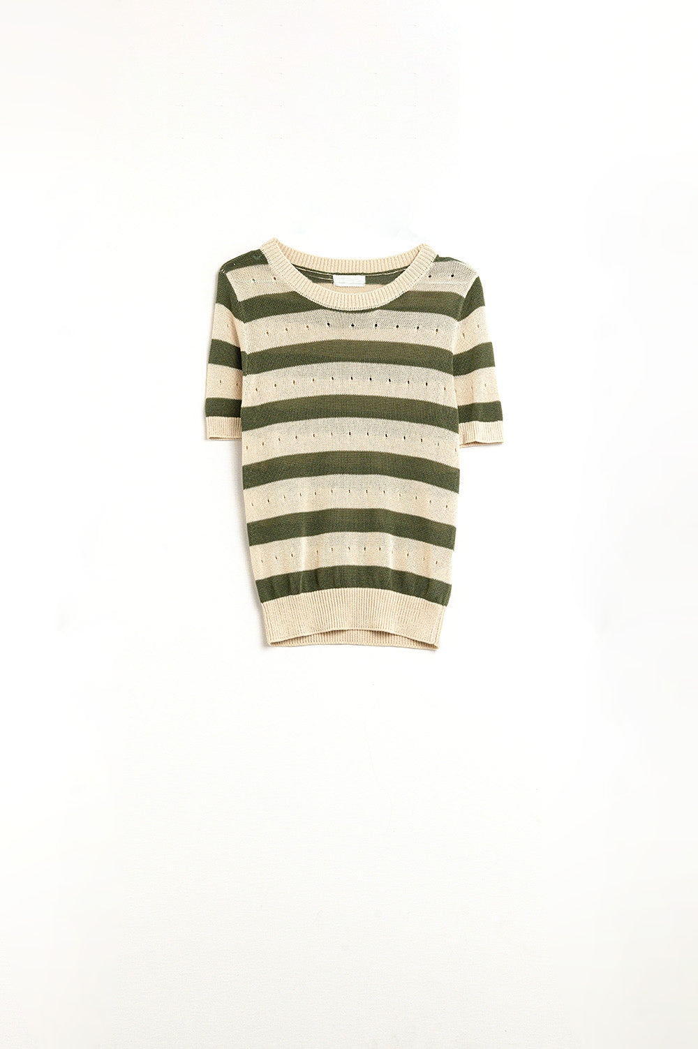 Pull rayé vert et beige femme en maille ajourée – manches courtes