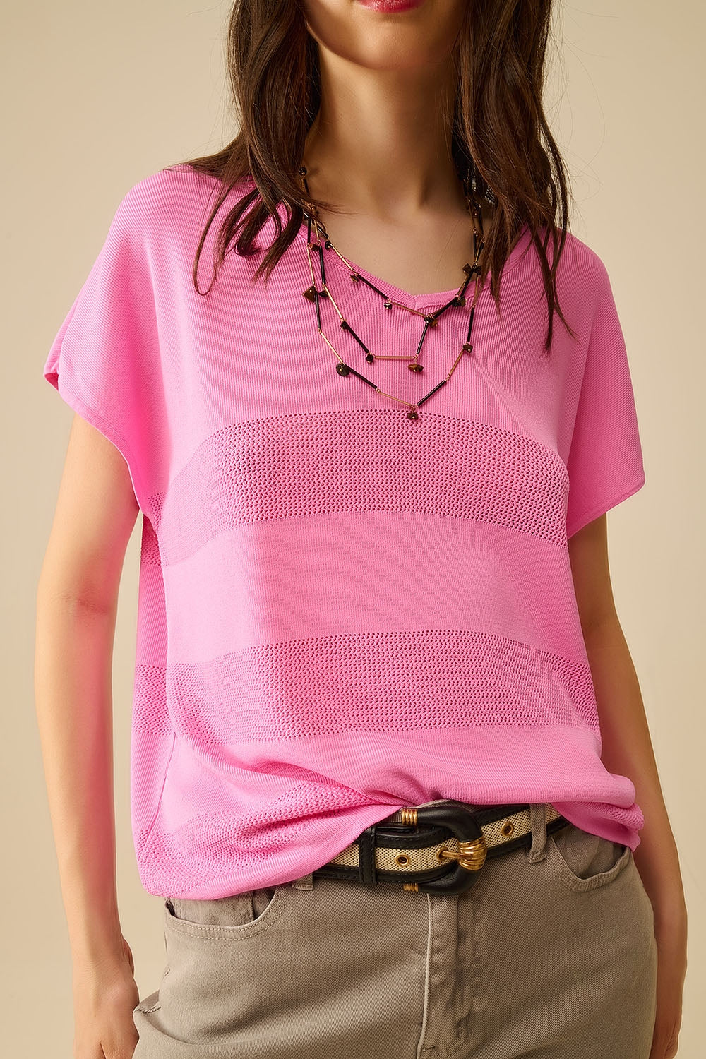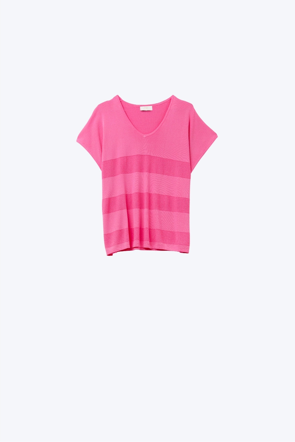 Pull col V fuchsia manches courtes femme – Couleur vibrante et texture raffinée