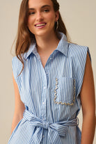 longueur: Longueur midi. SousCategorie: Robe. collier: Col polo. Manches: Style sans manches. Imprimer: motif à rayures. Coupent: Ajustement standard. Style: Style de tous les jours. détail: Ceinture du même tissu incluse. Tissu: Popeline. Fermeture : Patte de boutonnage. runs true to size. S.