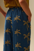 🔹 Détails marquants : Imprimé palmier bleu rehaussé d’une broderie beige raffinée, taille élastique avec cordon de serrage, poches latérales pratiques