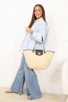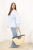 Pensé pour accompagner vos journées actives avec allure, ce sac cabas effet paille combine volume généreux et détails structurés. Son contraste entre la texture naturelle et les finitions noires lui permet de s’intégrer facilement dans un vestiaire moderne et soigné.