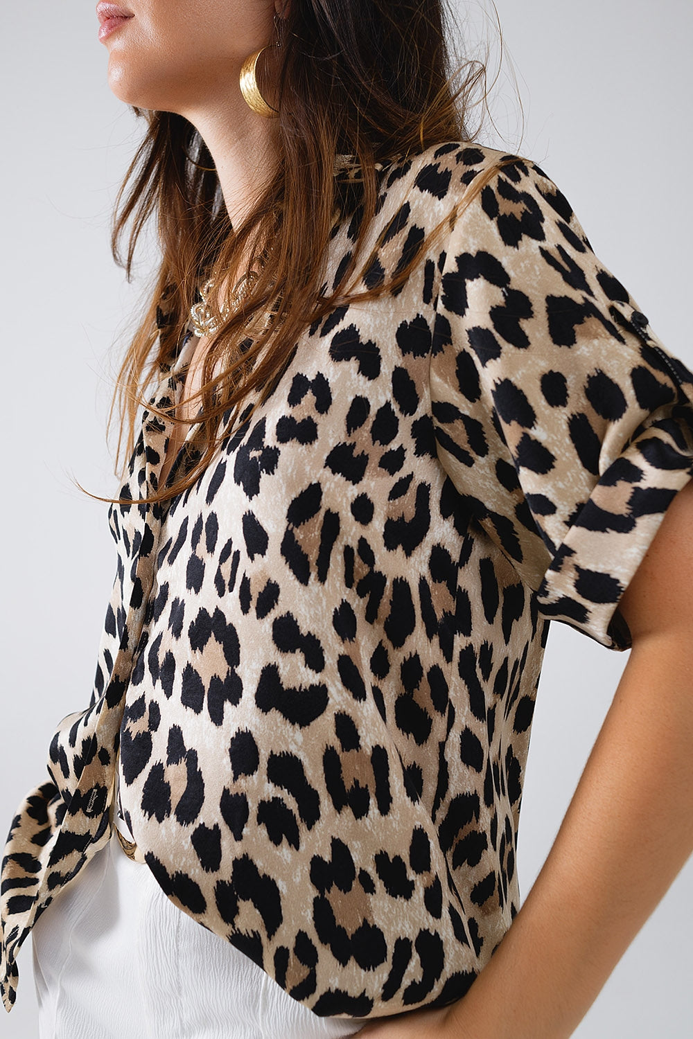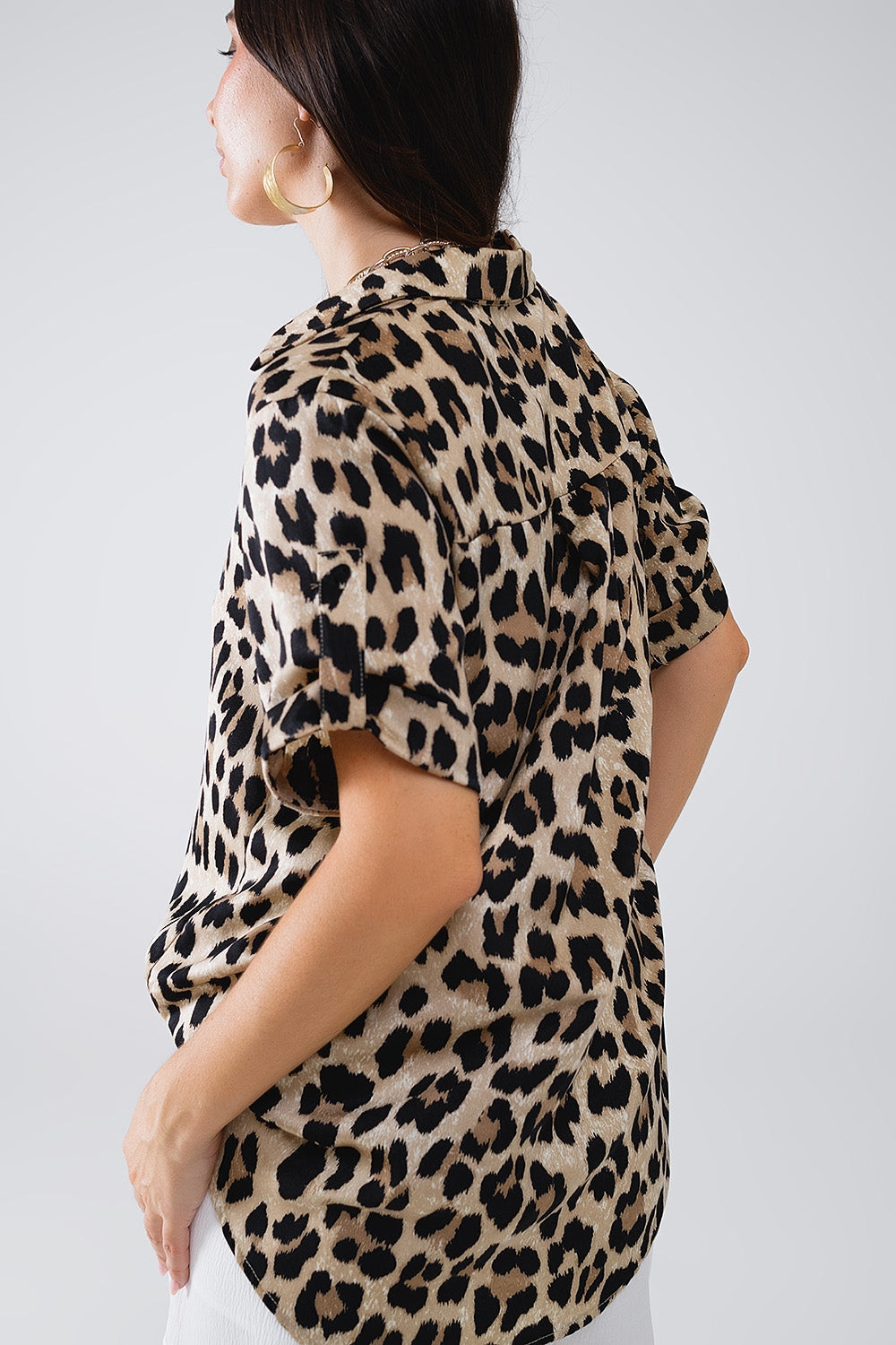 Chemise surdimensionnée en satin avec col polo patte de boutonnage et manches courtes à poignets roulés. En imprimé léopard très tendance à porter avec un pantalon ou un short pendant l'été.