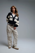 Un essentiel confortable qui attire l’œil sans en faire trop : ce cardigan rayé noir et crème mise sur une maille épaisse texturée et une encolure V flatteuse. Les paillettes discrètes captent la lumière avec subtilité, tandis que les gros boutons signent une pièce facile à porter au quotidien.