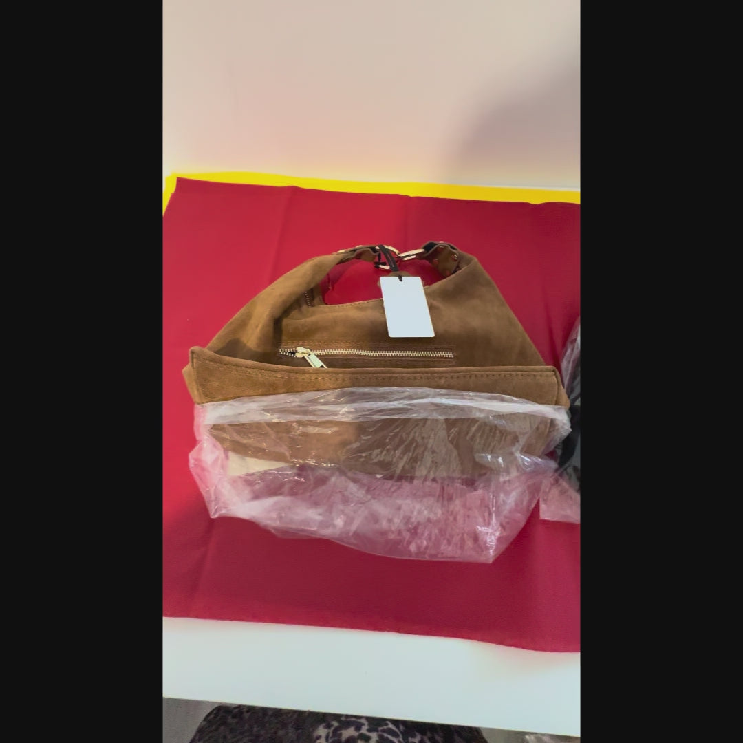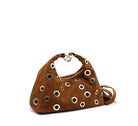 Un format compact qui fait son effet au quotidien. Ce sac hobo en suédine camel se distingue par ses oeillets métalliques dorés et sa poignée anneau. Léger, doux au toucher et facile à porter, il accompagne aussi bien vos looks tailleur que denim.