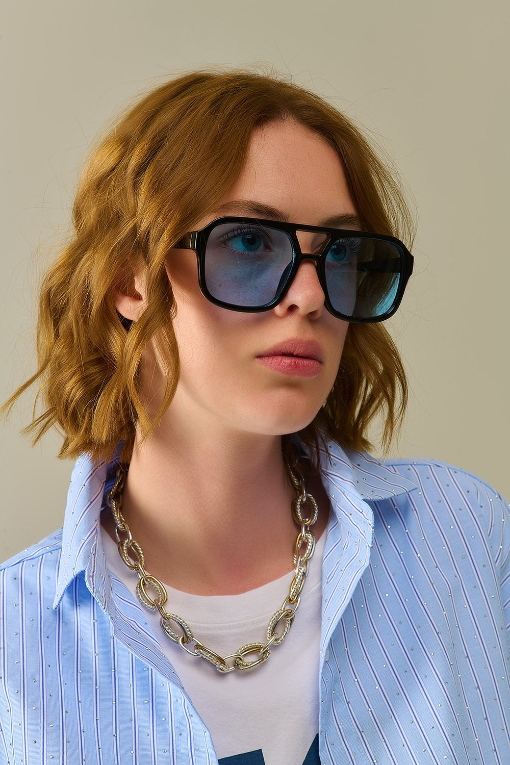 Black frame sunglasses with blue lenses