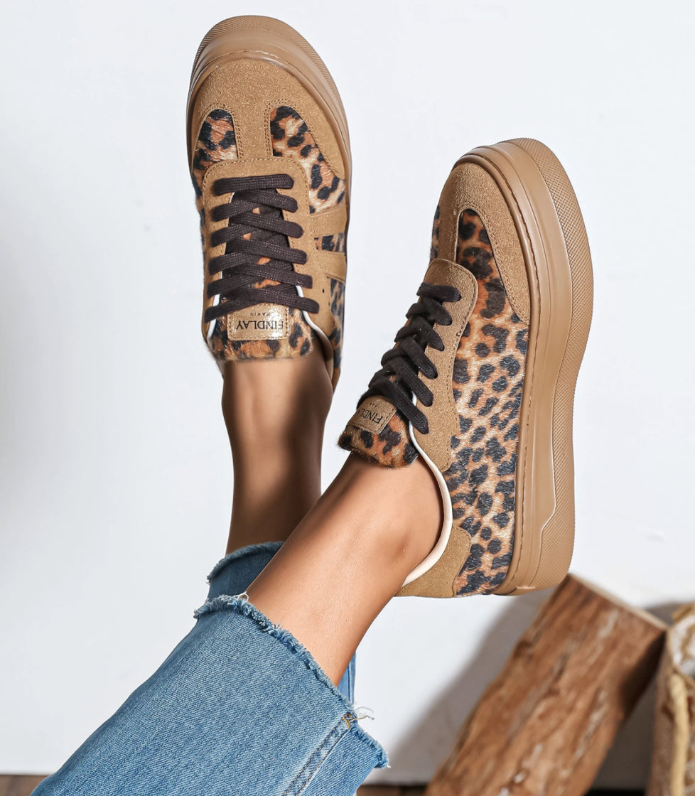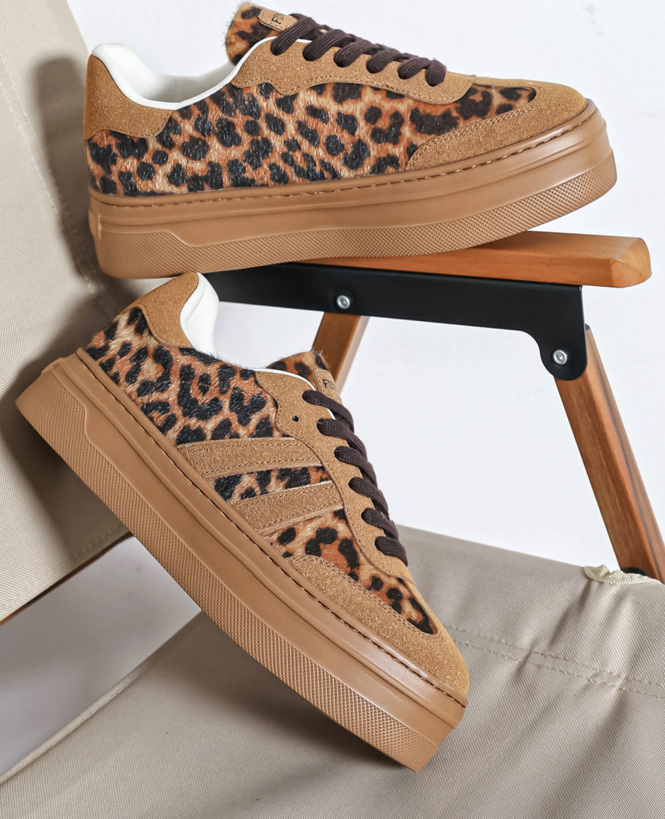Ces baskets imprimées léopard à effet fourrure apportent une touche mode raffinée et confortable grâce à leur semelle compensée en gomme. Deux bandes camel ton sur ton subliment le côté extérieur, tandis que les lacets noirs créent un contraste élégant.