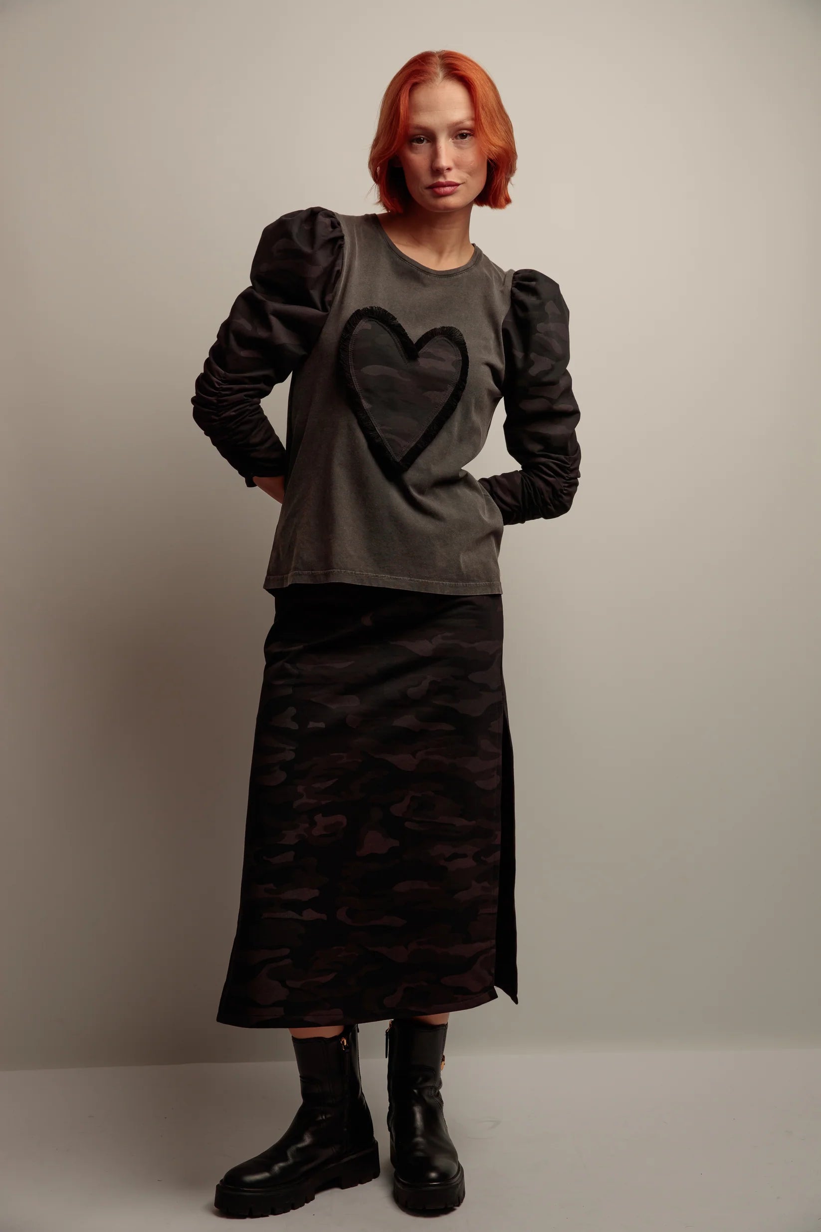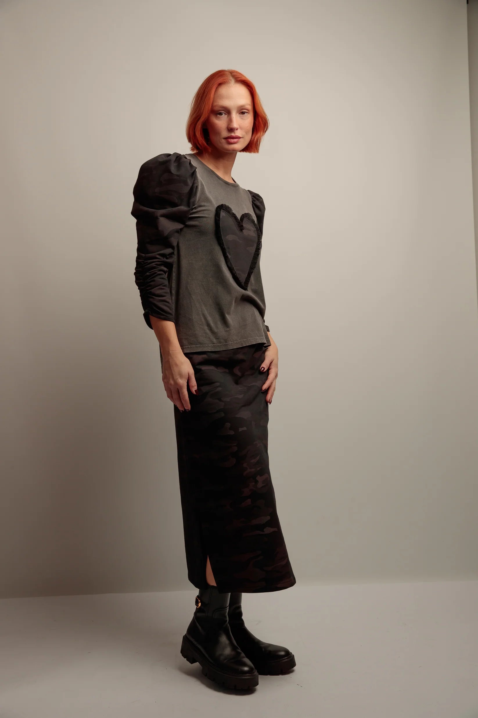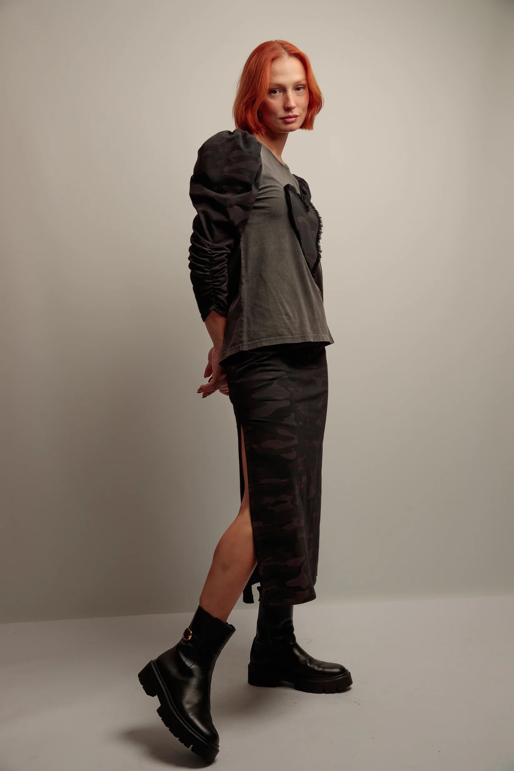 Une jupe midi en motif camouflage noir et gris qui allie confort et modernite. Sa maille douce avec interieur felpa offre une sensation agreable sur la peau, tandis que les fentes laterales apportent aisance et mouvement. La taille elastique garantit un maintien confortable tout au long de la journee. Confectionnee a Vigo, elle beneficie d’un savoir-faire soigne et de finitions de qualite.