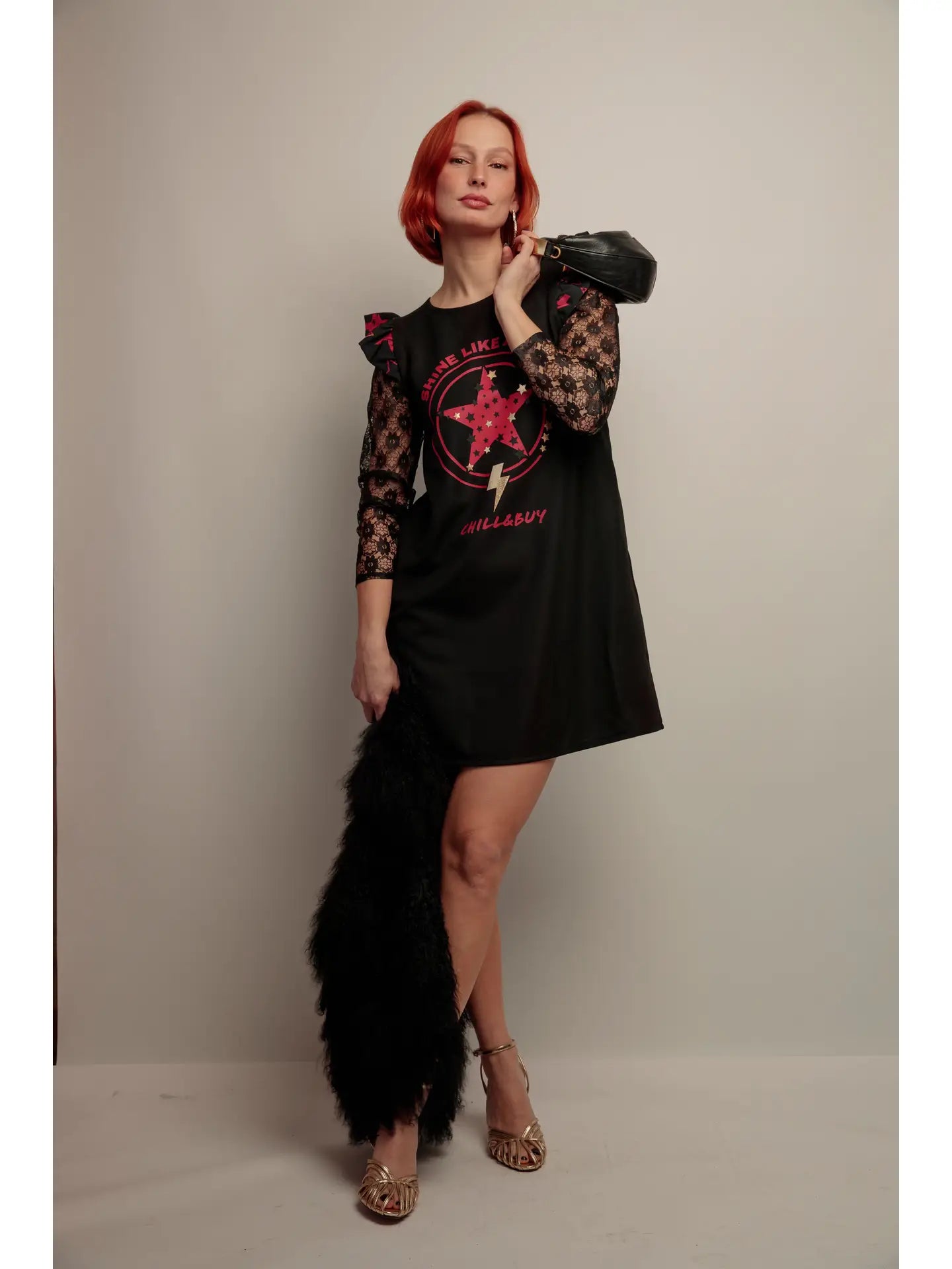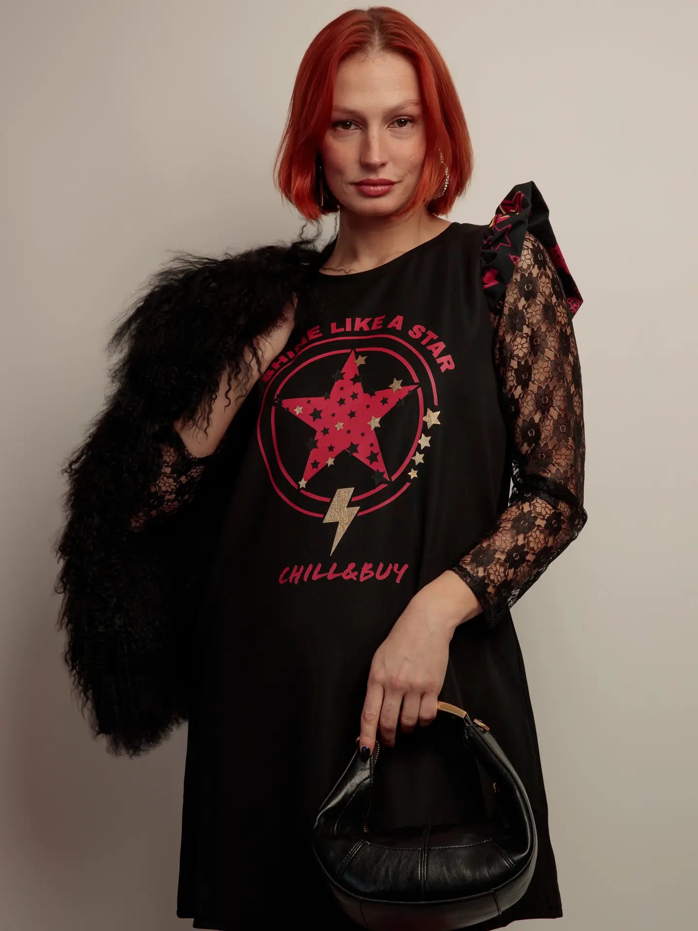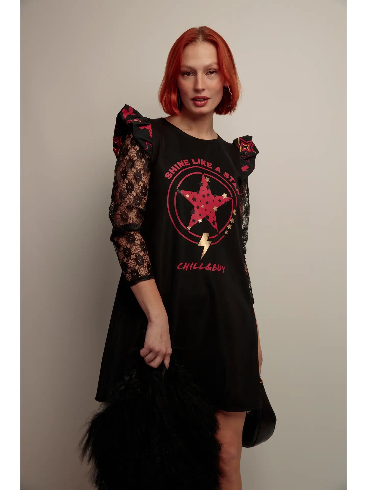 🔹 Détails marquants : Manches en dentelle noire, mini volant imprimé sur l’épaule, impression frontale contrastée, poches intégrées