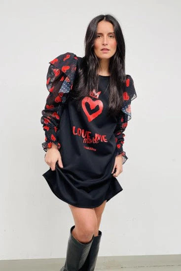 🔹 Details marquants : Imprime coeurs rouges, manches longues transparentes avec volants, message “Love Me More” contraste sur le devant