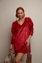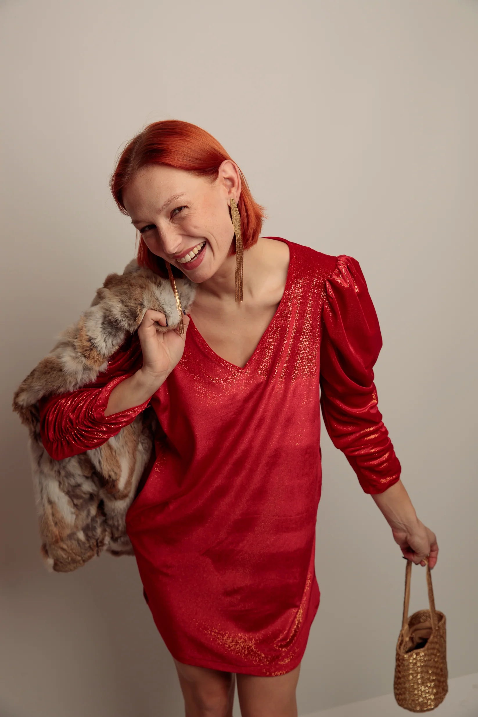 Cette robe courte en velours rouge illumine la silhouette grâce à sa finition satinée et ses micro-étincelles dorées. Son col en V et ses manches longues bouffantes apportent une allure moderne et féminine, parfaite pour rayonner sans en faire trop.